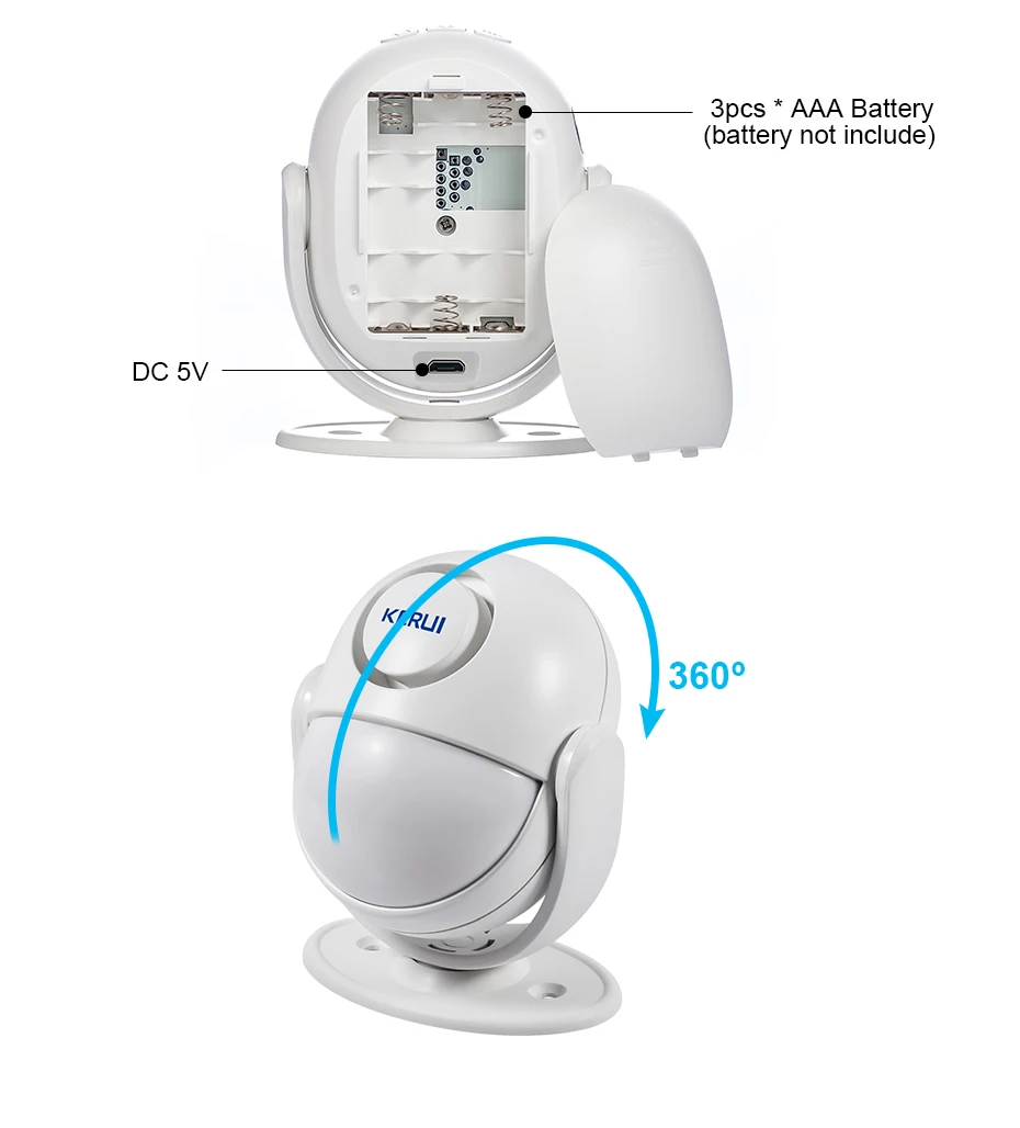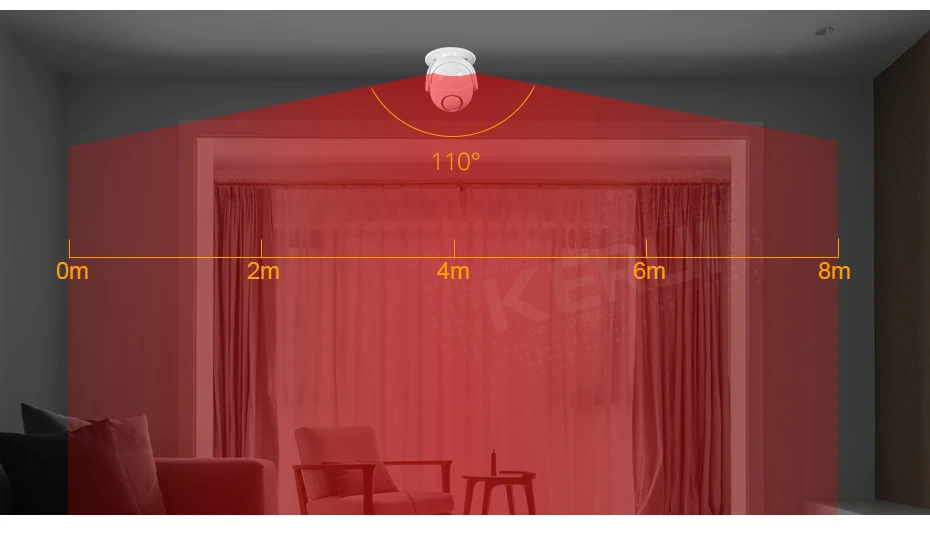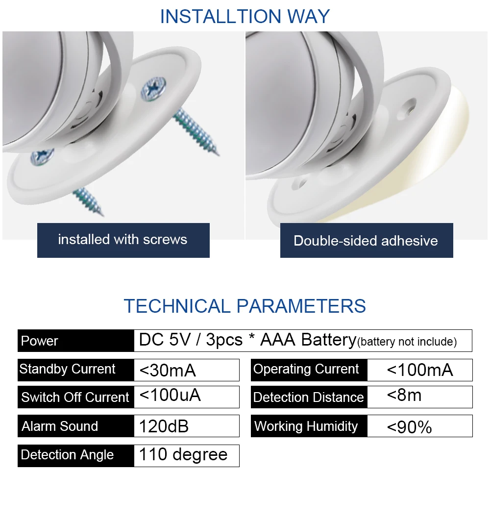 The alarm sound is 120dB The monitoring distance is 8M The monitoring angle range is 110°