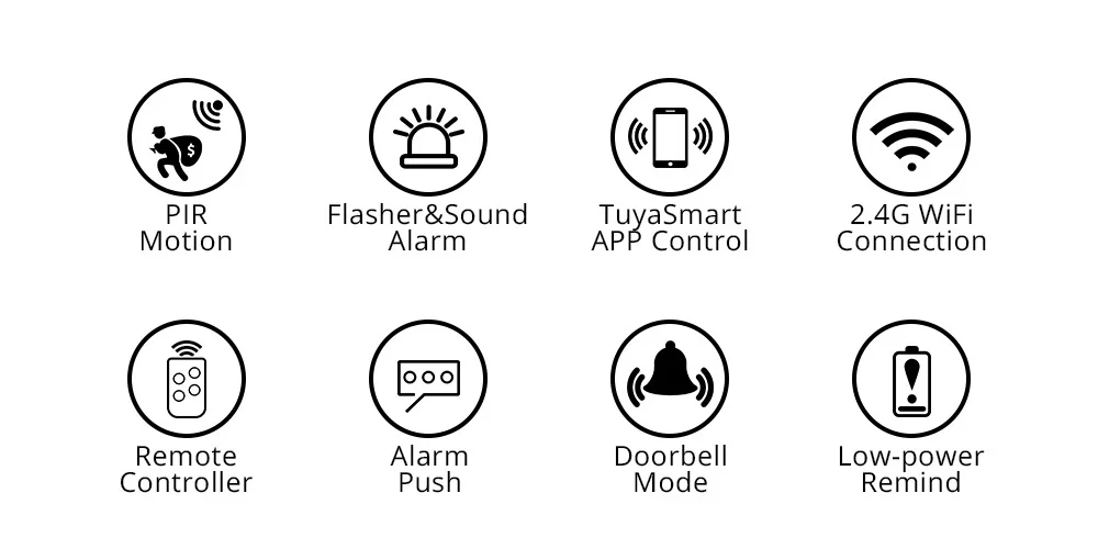 Motion detection | Flasher & Sound Alarm | Tuya app | WiFi connection | Remote controller | Alarm push | Doorbell modet | Low-power Remind