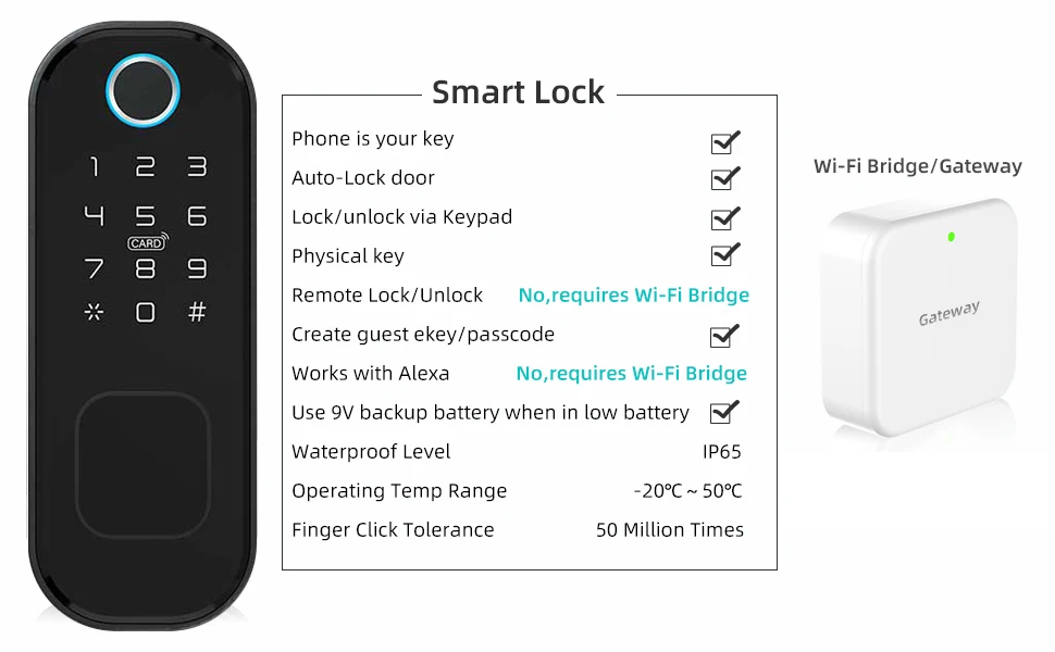 Добавьте Wi-Fi мост hornbill (продается отдельно), чтобы удаленно блокировать/разблокировать и контролировать вашу дверь, а также интегрировать с Alexa, чтобы включить Голосовое управление.