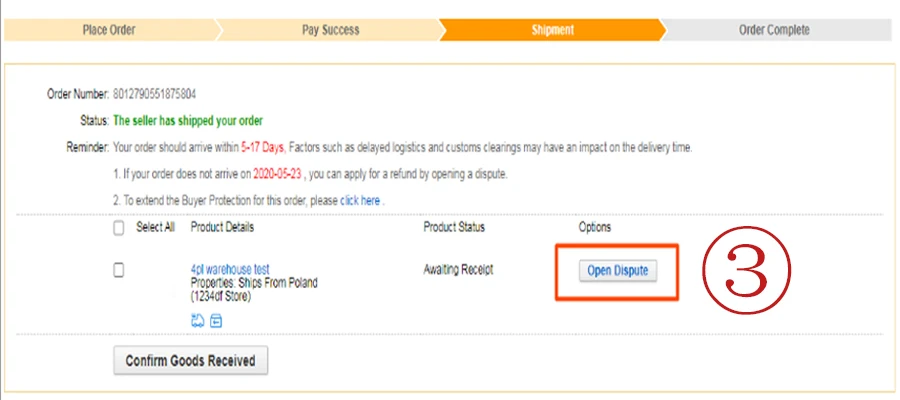 Если транспортировка товара является ненормальной, вы можете открыть спор, когда это 11 день после отправки товара.