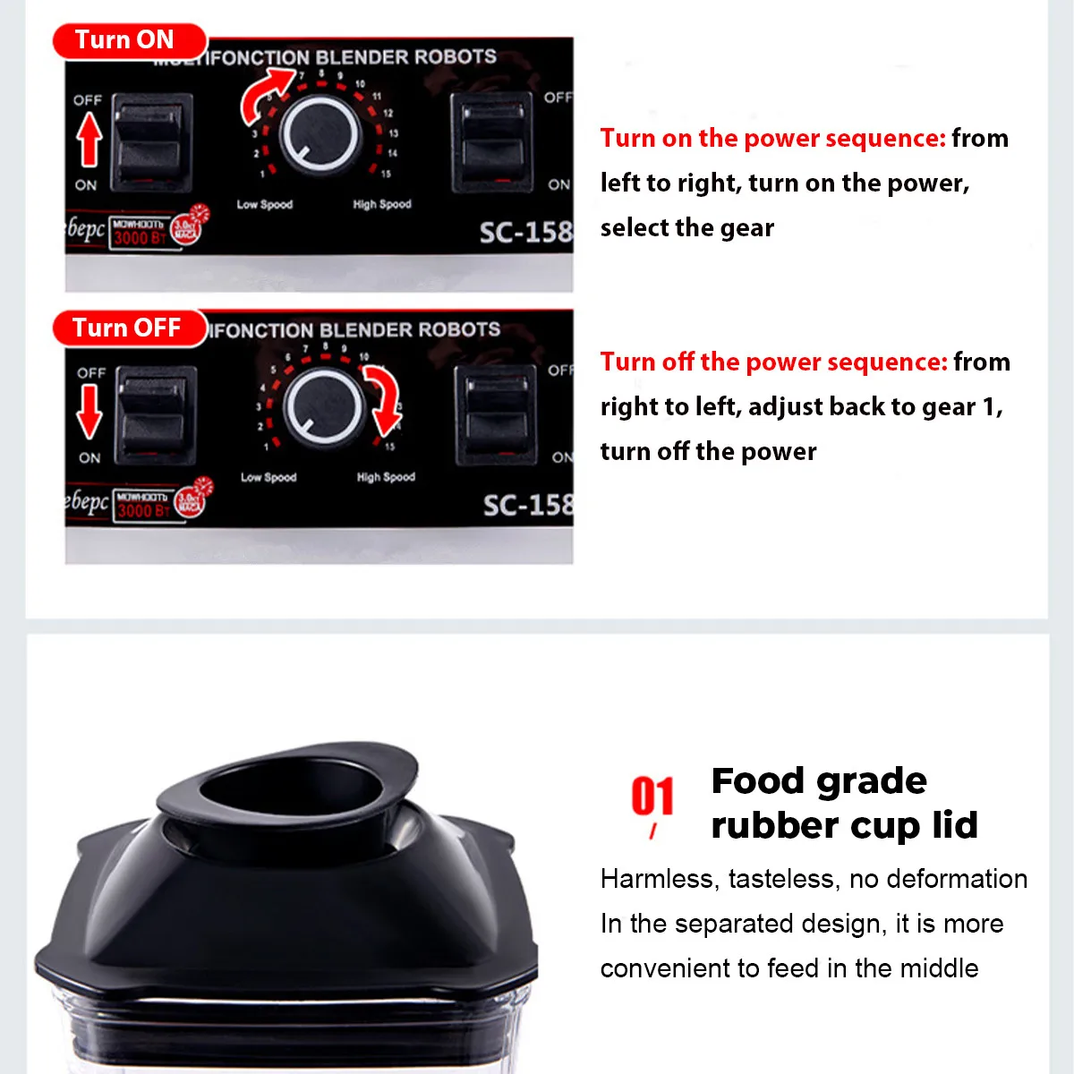 6. Крышка имеет съемный разъем позволяет добавить ингредиенты во время обработки. Разливные крышки вентиляционные отверстия позволяют горячей и холодной еде расширяться и сокращаться.