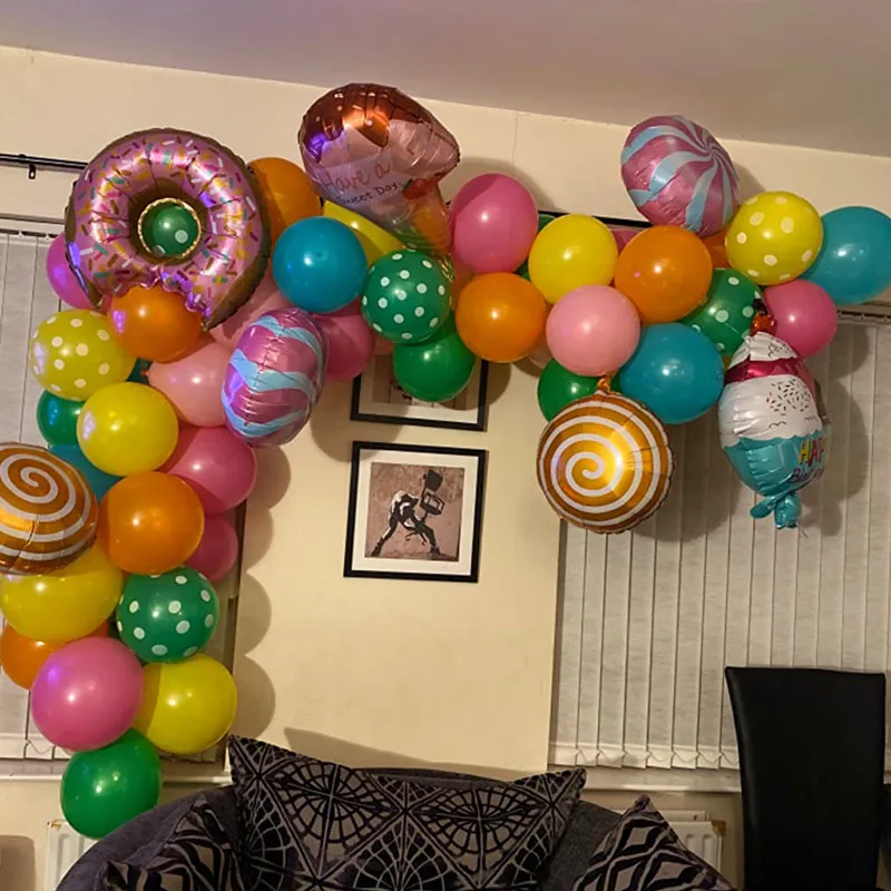 🍭🍨[Высокое качество и надежность] украшения на тему конфет изготовлены из высококачественного и прочного материала, нетоксичны и безопасны. Гигантские Воздушные шары из фольги изготовлены из натурального латекса и фольги, которые трудно сломать и отличного качества. Все остальные аксессуары тщательно подбираются, полностью соответствуют вашим потребностям