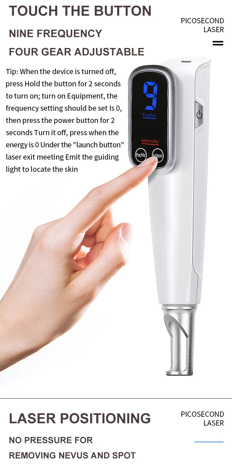 Совет: когда устройство выключено, нажмите удерживайте кнопку в течение 2 секунд, чтобы включить; Для включения оборудования необходимо установить настройку частоты 0, затем Нажмите кнопку питания в течение 2 секунд, чтобы выключить его, нажмите, когда энергия будет 0 под "запуск кнопки" выход лазера испускает направляющий светильник, чтобы определить местоположение кожи