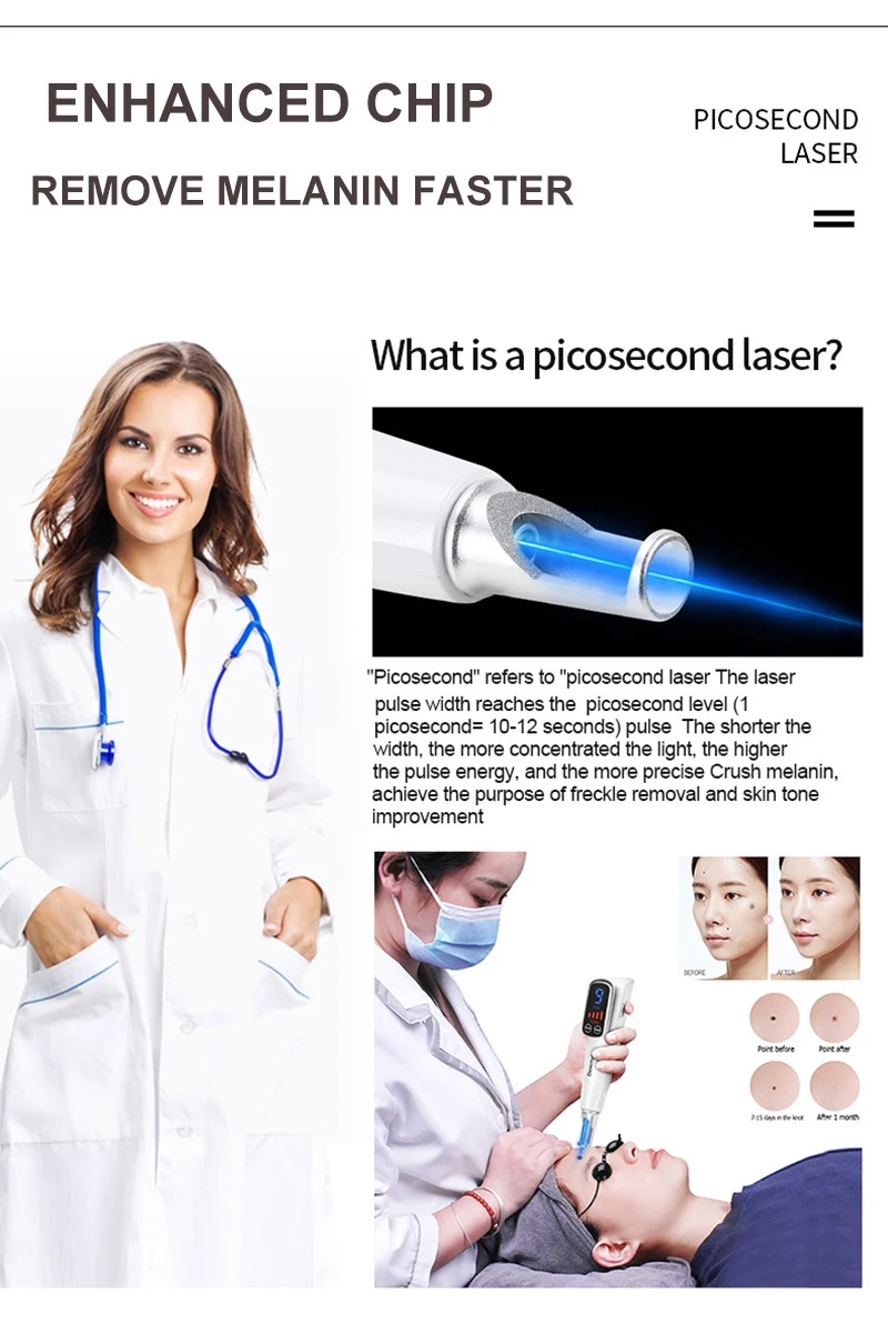 «Пикосекунда» означает «пикосекундный лазер, ширина лазерного импульса достигает пикосекундного уровня (1 пикосекунда = 10-12 секунд), чем короче ширина, тем более концентрированный светильник, чем выше импульсная энергия и тем точнее измельчает меланин, тем лучше удаление веснушек и улучшение тонуса кожи.