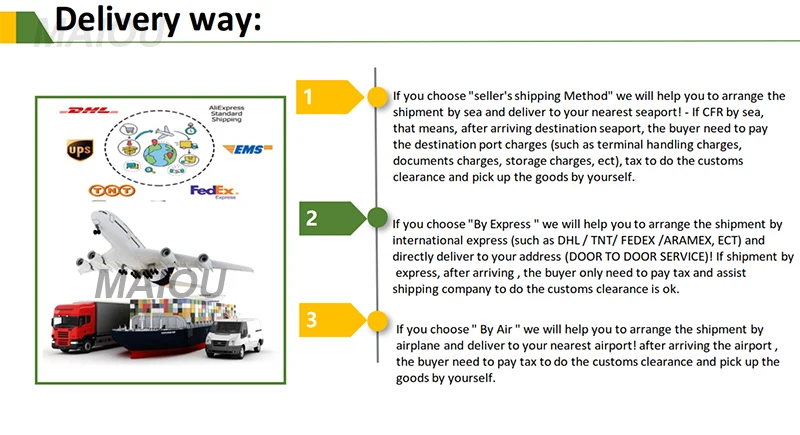 2. Если вы выберете «экспресс», мы поможем вам организовать доставку международной экспресс-почтой (например, DHL / TNT/ FEDEX /ARAMEX и т. Д.) И непосредственно доставляем по вашему адресу (от двери до двери)! При отправке экспресс-почтой, после прибытия, покупатель должен только оплатить налог и помочь транспортной компании, чтобы сделать таможенное оформление в порядке.