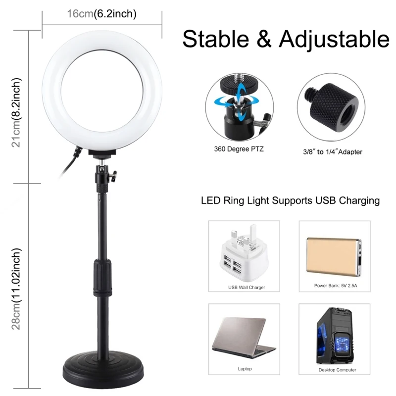 1. Металлическая Выдвижная рама для шеи, регулировка высоты мин. 18 см до 28 см. 2. Регулируемый Настольный мини настольный светильник, светодиодный светильник, Настольный светильник для макияжа. 3. Элегантный и стильный дизайн, прочный, легкий, портативный. 4. Легко носить и устанавливать; Круглое основание, более стабильное. 5. Стандартный резьбовой винт 1/4 дюйма, можно подключить к стабилизатору карданного шарнира, адаптеру головки штатива.