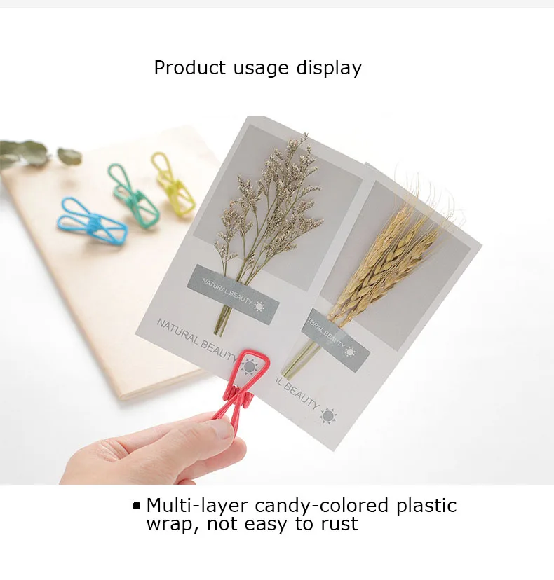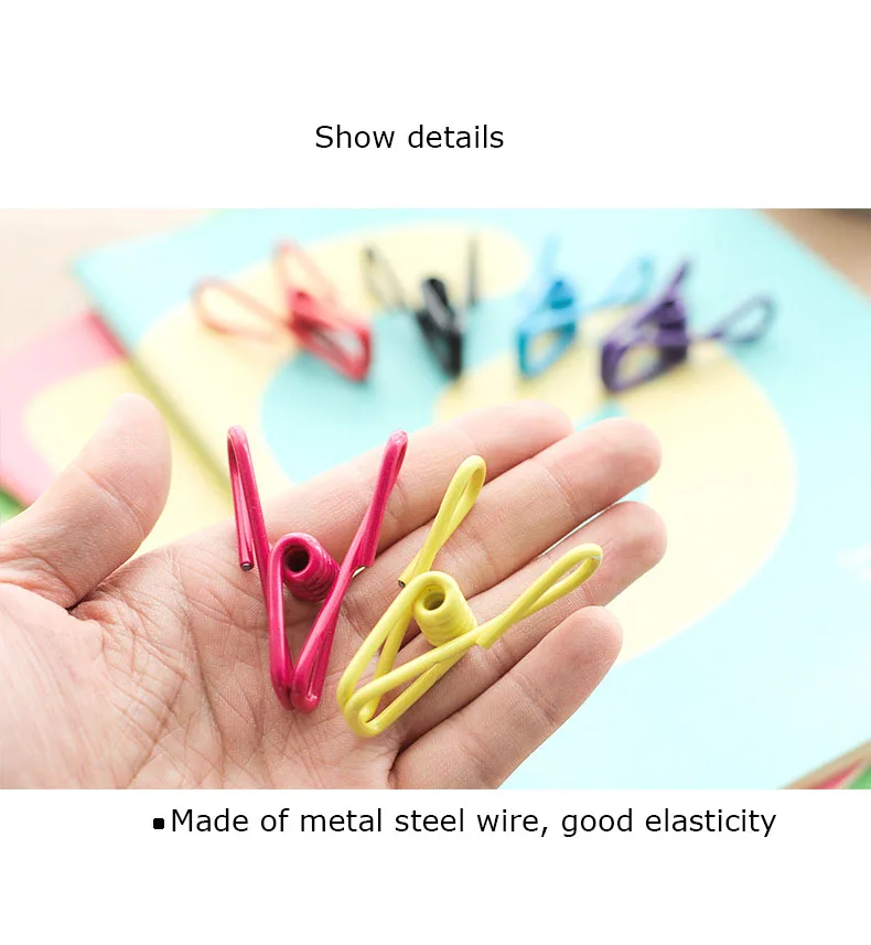 -Может использоваться для подвешивания одежды и других целей. -Прочный и прочный, не легко скользить, ветрозащитный и прочный. -Многоцелевые зажимы используют их для всех, таких как булавки для одежды, или зажимают некоторые повседневные товары, такие как бумажные файлы, закуски. -Вмещает одежду лучше, чем деревянные и пластиковые булавки для одежды, не оставляя следов скрепкой бумаги вместе. -Маркировка Вашей страницы в книжке, вешать сообщения, где вы можете их увидеть и многое другое. -Держать сумки закрытыми, повесить полотенца для посуды в пределах легкой досягаемости и организовать почту в считанные минуты.