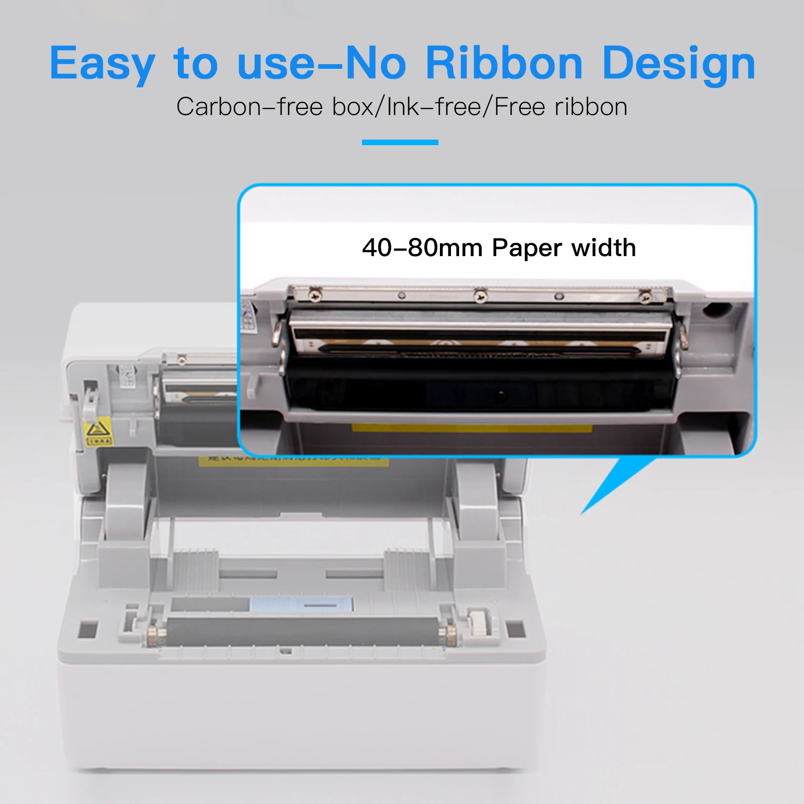 Нет дизайна бумажного ящика, бумага для печати находится вне принтера. Чернильный картридж или лента не требуются, низкая стоимость эксплуатации, термоэтикеточная бумага легко купить.