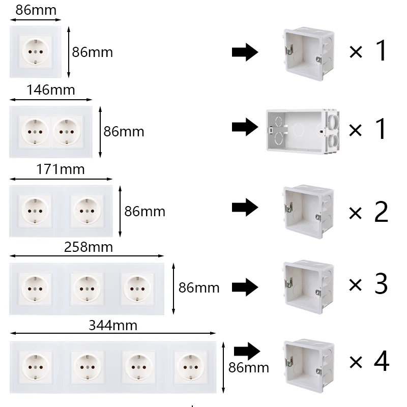 В: какие переключатели подходят для этого продукта? О: все выключатели типа 86 доступны. Все 86 продуктов типа, продаваемых в этом магазине, могут применяться. В: В чем разница между квадратной монтажной коробкой и круглой монтажной коробкой? О: многие розетки не могут быть установлены в круглую монтажную коробку, но могут быть установлены в эту коробку. В: Нужно ли купить несколько установочных коробок? О: покупателям необходимо определить количество выключателей. Как показано ниже.