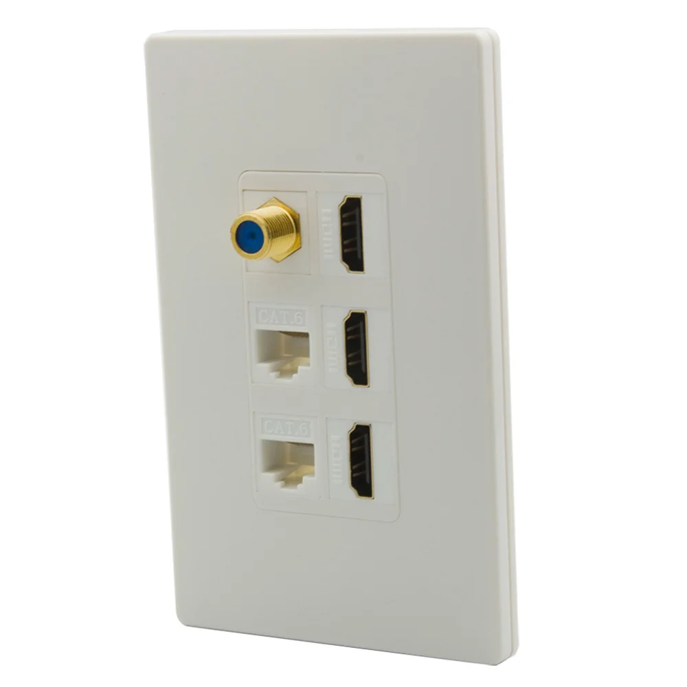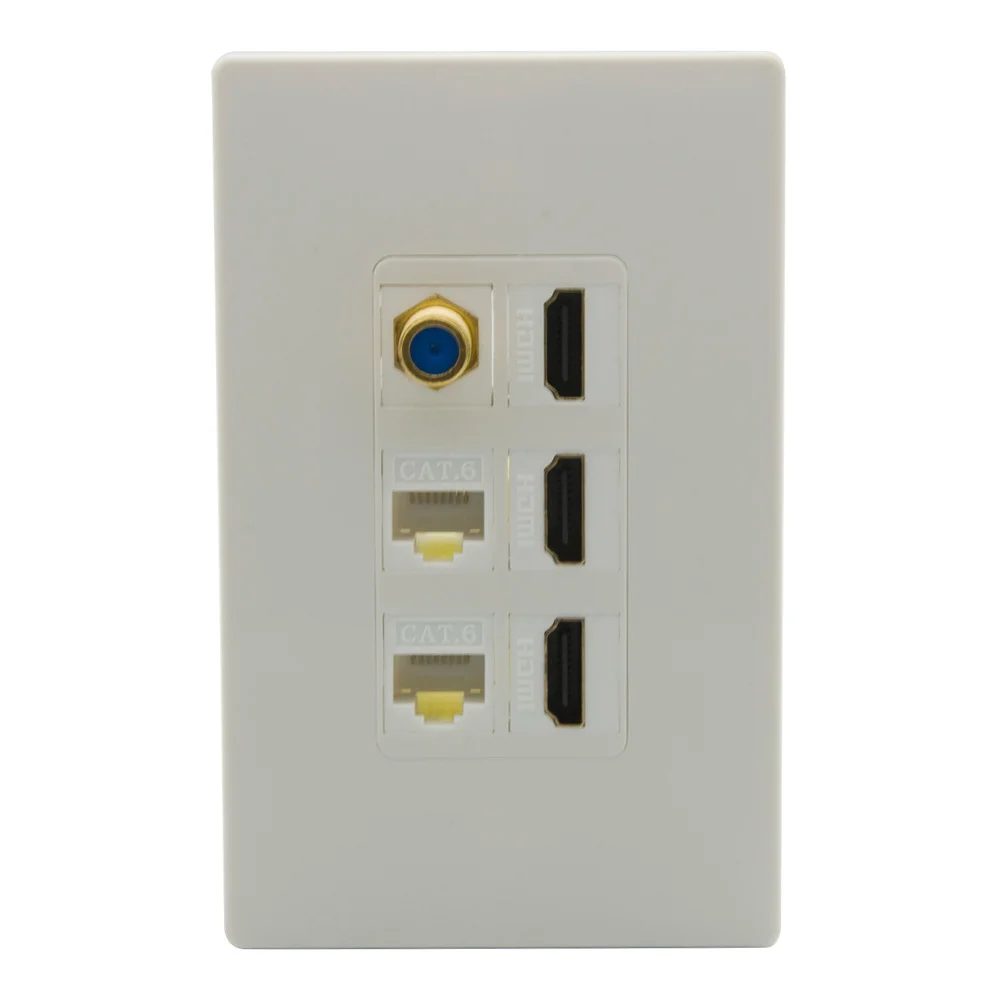 1 банды Нет Винт Стиль стены plat с 120X70 мм (Д X Ш X В). Интегрируйте 3 порта HDMI V2.0 Female В гнездовой разъем. Интегрируйте 2 порта CAT6 RJ45 Female В гнездовой разъем. Интегрируйте 1 коаксиальный разъем F RG6 Female В гнездовой разъем. Очень тонкая лицевая пластина толщиной всего 7 мм. Стандартные замочные отверстия, чтобы поместиться в любой ключ Джек и поддержка настройки.
