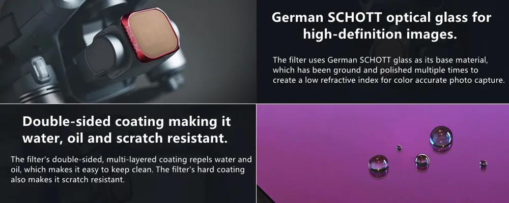 Фильтр имеет твердое покрытие, которое защищает объектив и датчики, предотвращая попадание УФ-светильник в камеру. Он блокирует синий светильник, который не дает изображениям выглядеть голубовато или беловато при съемке на открытых пространствах, как на море или в больших полях.