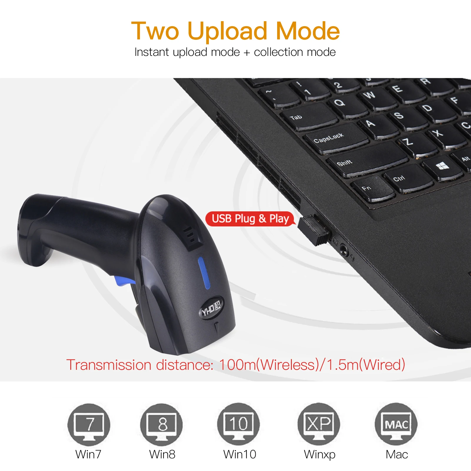 2 режима загрузки: Поддержка режима мгновенной загрузки/режима сбора, в режиме сбора и при условии беспроводной передачи 2,4G, отсканированный штрих-код (макс.. 100000) будут храниться в встроенной веб-камеры-хранения сканер и будут загружены в партии, также может быть пересчитать.