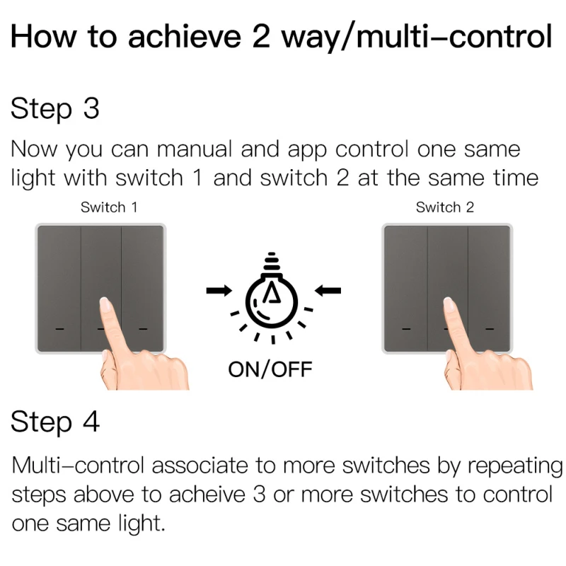 2. Новая идея для 2/3 канальной цепи (два переключателя управляют одним светом), что объясняется мультиуправляемой связью этого переключателя с другими умными переключателями в приложении; состояние реле Вкл/Выкл, как и запоминание последнего состояния при выключении питания и настройке переключателя подсветки в приложении Smart Life для лучшего сна ночью; Емкостное сенсорное управление, Включите/выключите свой свет одним касанием и устойчивой к царапинам стеклянной панелью придаст лучший вид, гармонируя с любым дизайном стен. (Примечание: Вы можете несколько контролировать связь этого переключателя с несколькими разными переключателями, но несколько банд на одном переключателе недоступны, для мультиуправления может быть связана только одна группа на одном переключателе.)