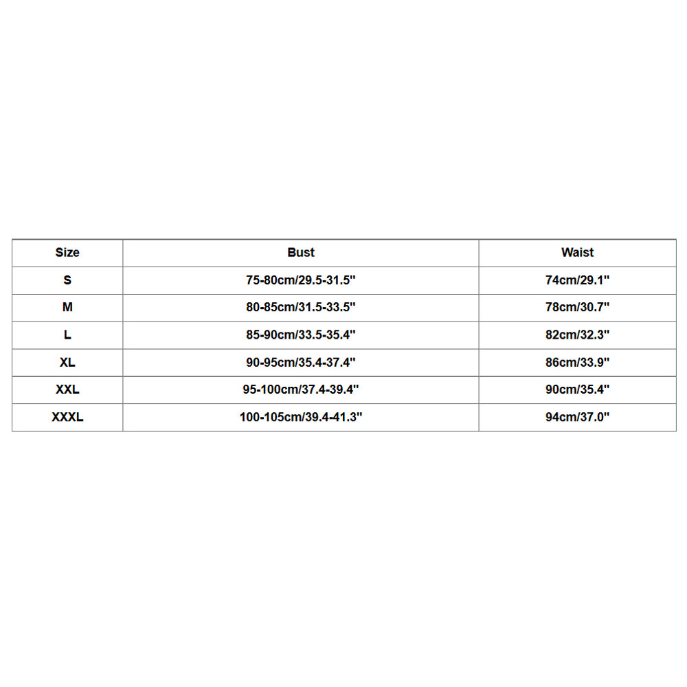 Что вы получаете: 1 бюстгальтер; 1 х трусы Размеры Бюст Талия S 75-80 см/29,5-31,5 дюйма 74 см/29,1 дюйма М 80-85 см/31,5-33,5 дюйма 78 см/30,7 дюйма L 85-90 см/33,5-35,4 дюйма 82 см/32,3 дюйма XL 90-95 см/35,4-37,4 дюйма 86 см/33,9 дюйма XXL 95-100 см/37,4-39,4 дюйма 90 см/35,4 дюйма XХХL 100-105 см/39,4-41,3 дюйма 94 см/37,0 дюйма