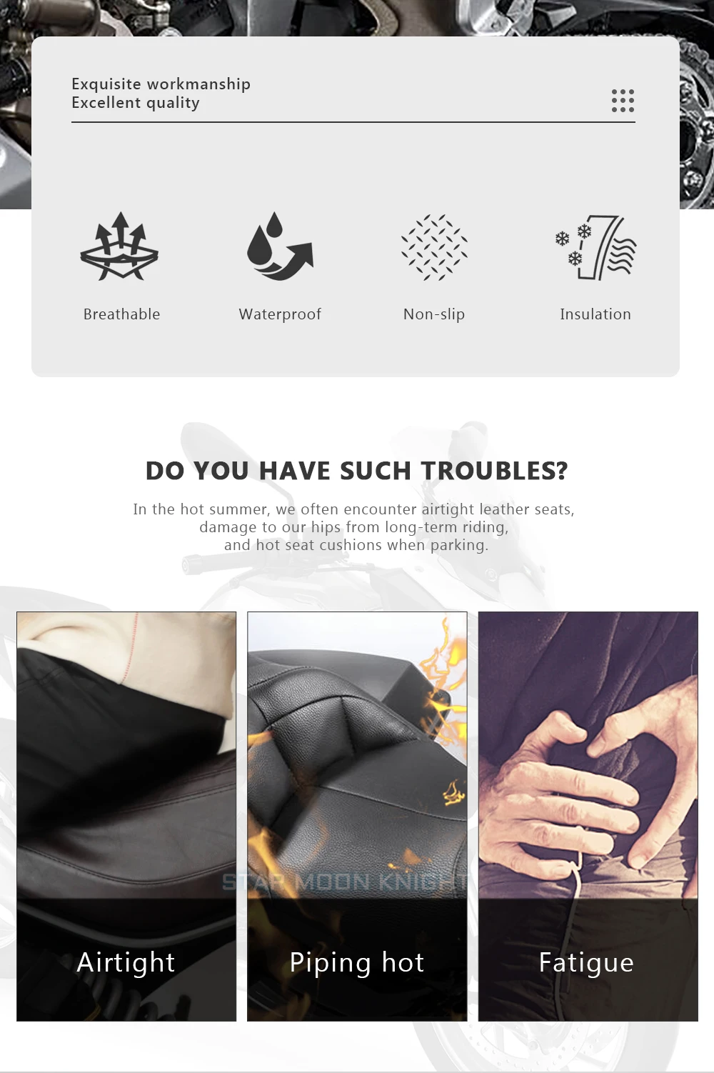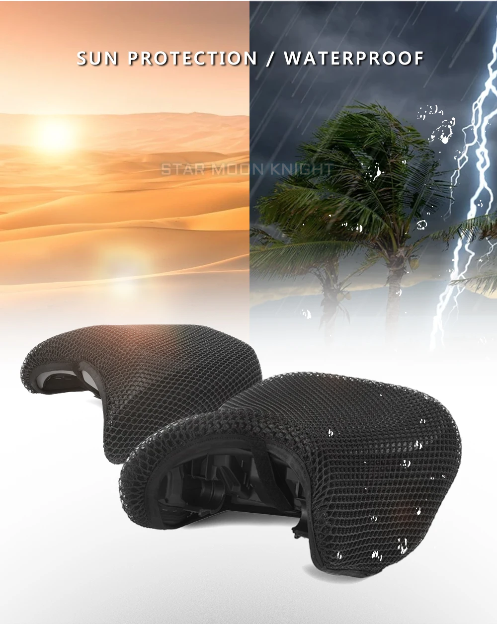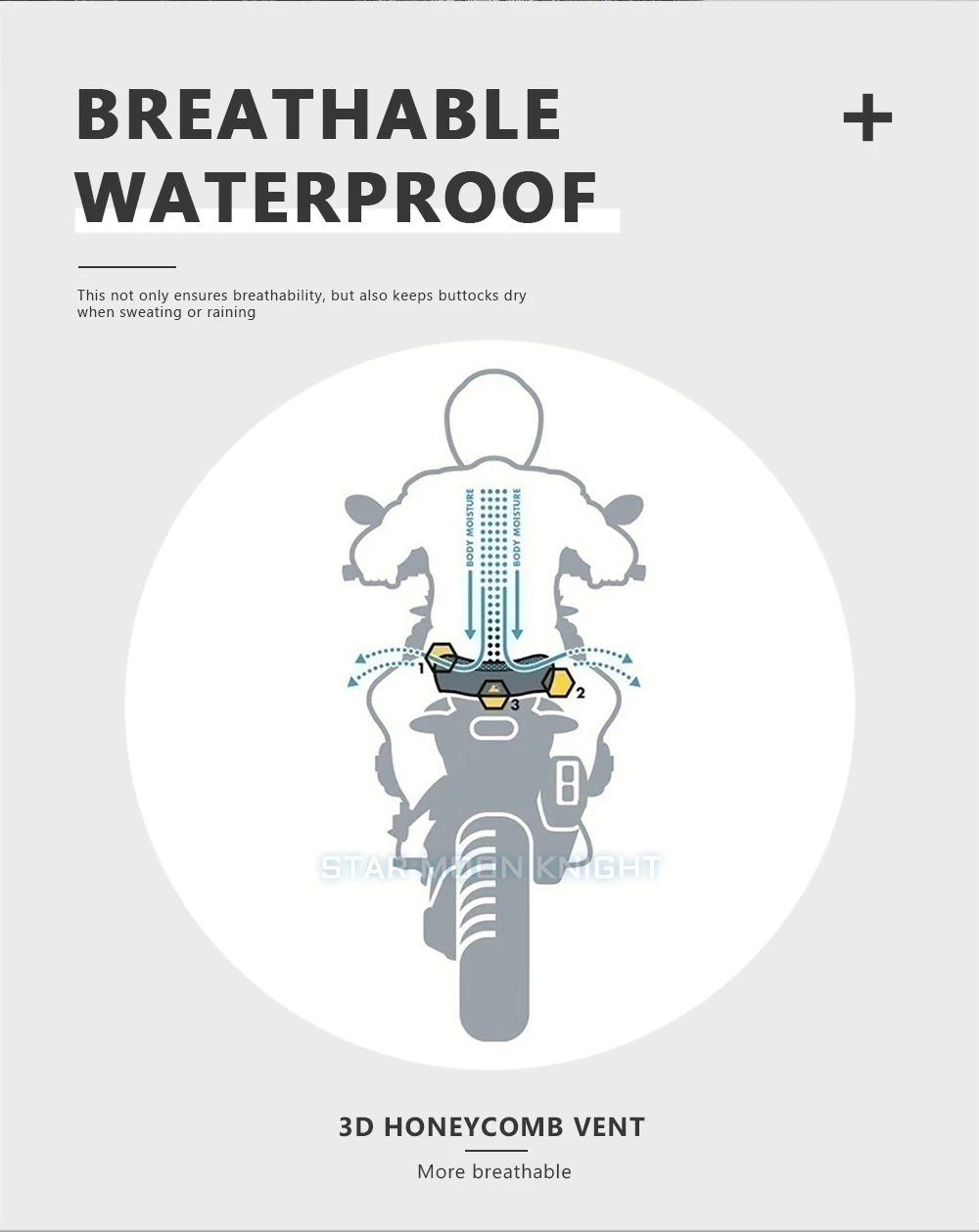 Этот чехол для сиденья-это кондиционер для вашего оригинального сиденья мотоцикла. Воздух может циркулировать во время вождения, потому что крышка трехмерная. Даже при большом весе, он не может быть полностью сжатым: это не только обеспечивает воздухопроницаемость, но и сохраняет ваши ягодицы сухими, когда идет дождь. Крутой чехол не нагревается даже при прямых солнечных лучах. Еще один плюс: это создает массажный эффект и тем самым уменьшает признаки усталости.