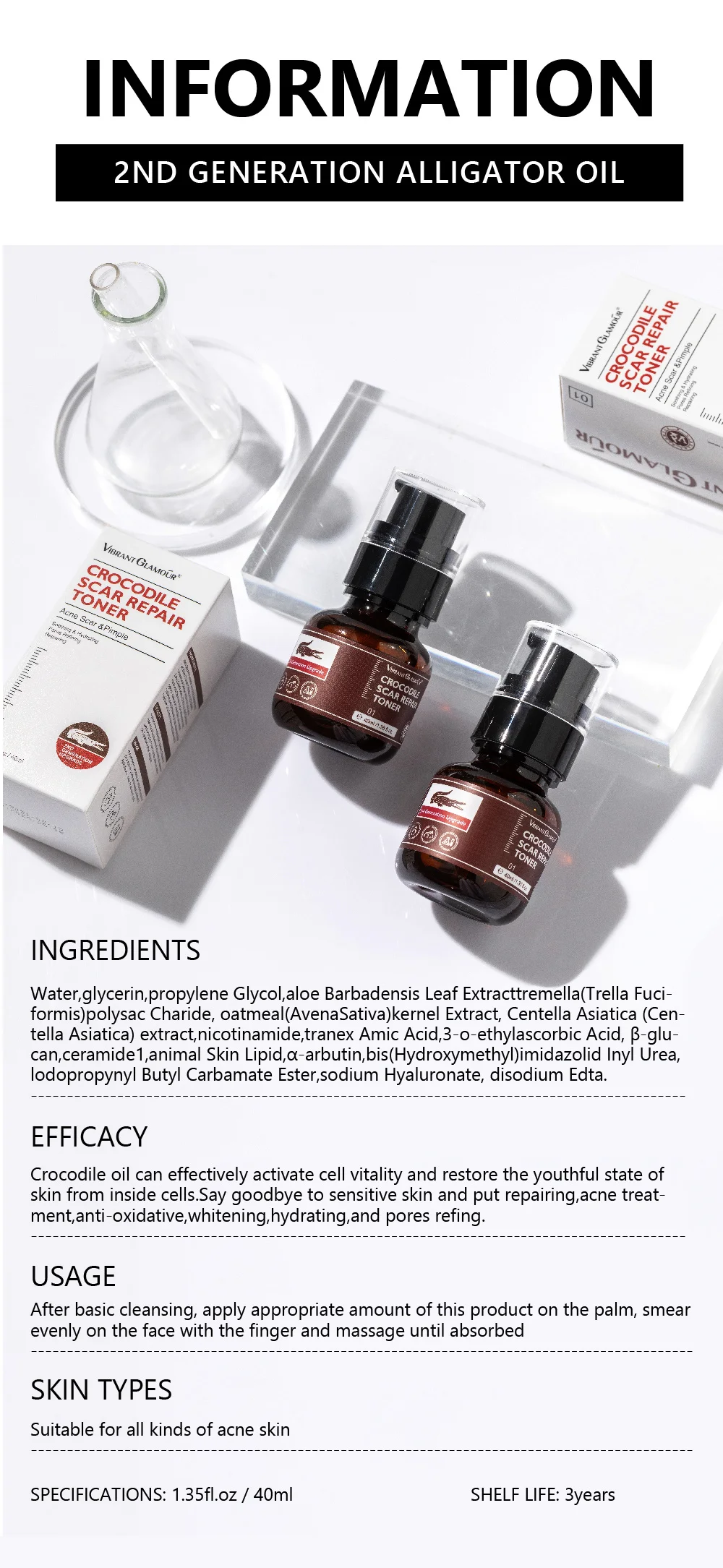 Ингредиенты? Вода, глицерин, пропиленгликоль, алоэ Barbadensis экстракт листьев (Trella Fuci- formis) полисахарид, Овсянка (AvenaSativa) экстракт ядра, центелла Asiatica (Cen- tella Asiatica), экстракт tranex Amic Acid, 3-o-этиласкорбиновая кислота, β-глу-Кан, ceramide1, липид кожи животных, α-арбутин, бис (гидроксиметия) имидазолид инил мочевины, лопропинил бутиловый карбамат, натрий Динатрия Edta.? Эффективность? Крокодиловое масло может эффективно активировать жизненную силу клеток и восстановить молодость кожи внутри клеток. Попрощайтесь с чувствительной кожей и положите ремонт, лечение акне, антиоксидантное, отбеливание, увлажнение и сужение пор.? Использование? После основного Очищайте, нанесите соответствующее количество этого продукта на ладонь, равномерно Смажьте на лицо пальцем и массируйте до впитывания? Типы кожи? Подходят для всех видов акне Кожа