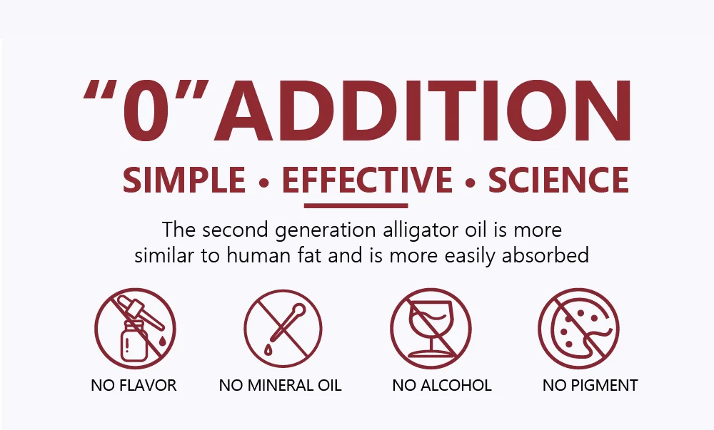 Физико-химические свойства крокодилового масла второго поколения близки к Жиру тела, таким образом, обладает хорошей проницаемостью, чрезвычайно легко для принятия и поглощения кожи человека и canquicy стимулирует клетчатый состав человеческого тела, фильтрует фактор восстановления, разложение поврежденных клеток, способствует метаболизму, повышает целлюлозную силу, быстрое пролиферацию, градуирует демагированную кожу