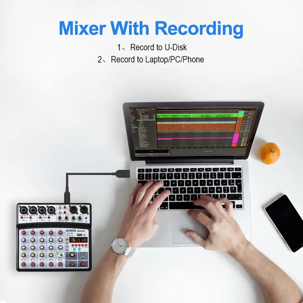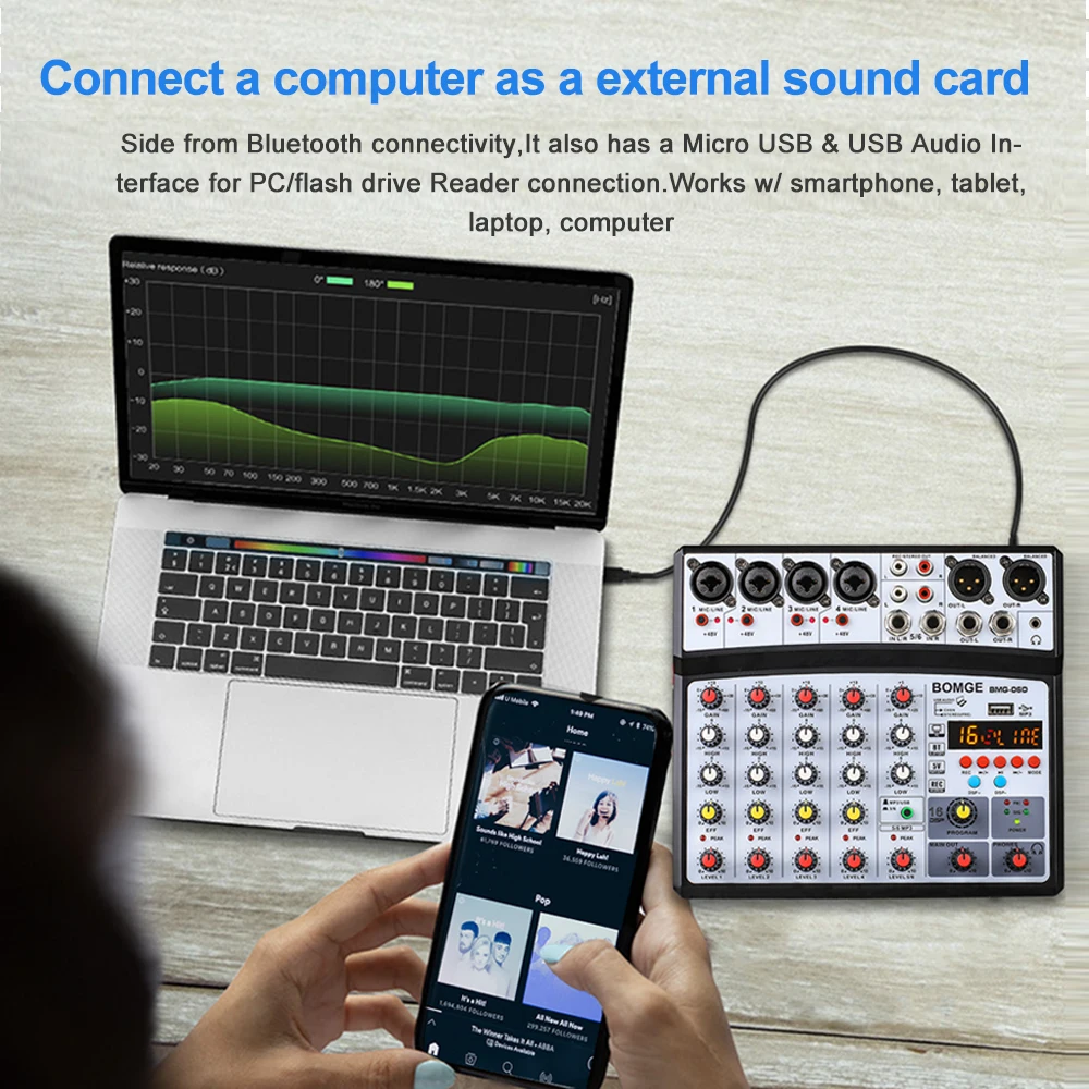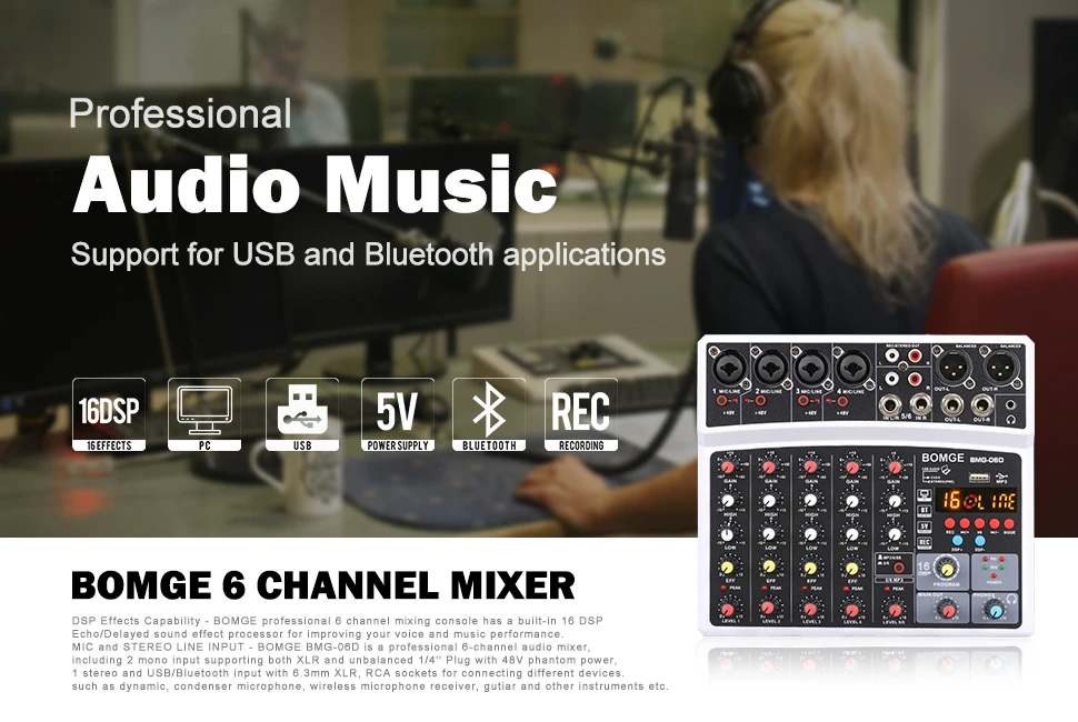 1 función de Efecto DSP-el mezclador profesional BOMGE de 6 canales tiene un procesador integrado de 16 efectos de sonido de eco/retardo DSP, que crea más posibilidades para su música y trae varios cambios a su sonido. Por ejemplo, se utiliza para cambiar la voz durante la transmisión en vivo y la grabación de doblaje.