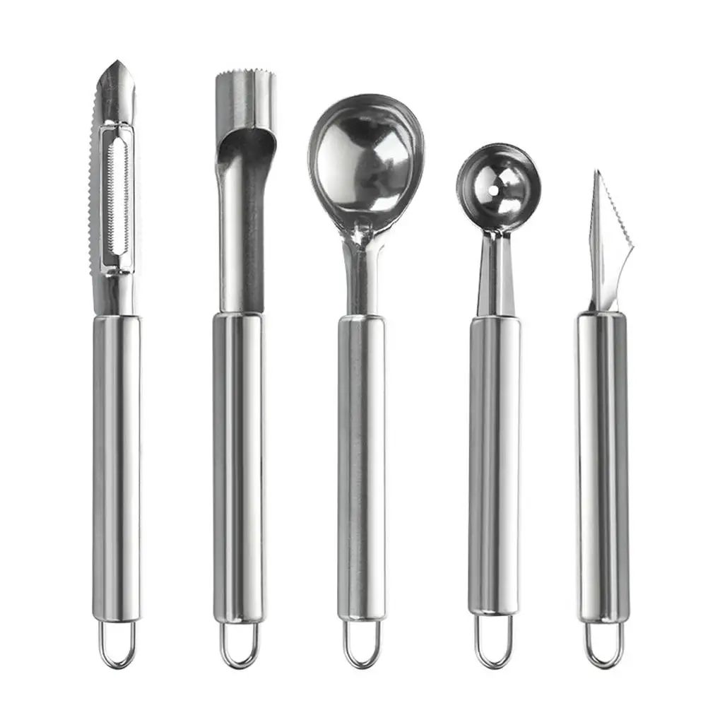 1. Посылка включает в себя: 1 * резак для резьбы + 1 * ложка для копания фруктов + 1 * ложка для мороженого + 1 * средство для удаления сердцевины + 1 * резак для пилинга, набор из 5 инструментов, для удовлетворения ваших различных потребностей, делая изысканные тарелки украшения.