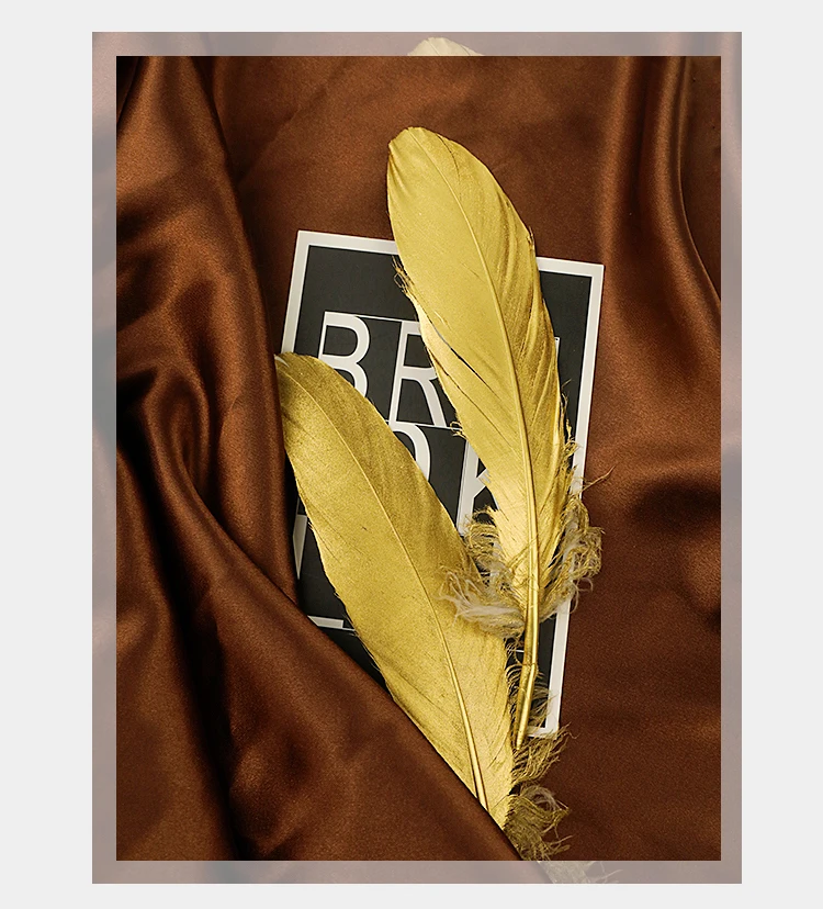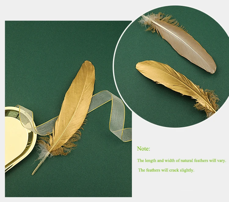 Название: Золотое перо Размер: Большой 15-20 см, маленький 10-15 см 1. Натуральные перья изготовлены из краски, распыленной металлической текстурой. Очень текстура, подходит для съемки с металлическими ювелирными изделиями, косметическим макияжем и средствами по уходу за кожей. 2. Длина, ширина и форма натуральных перьев будут отличаться, и будут растрескиваться перьями. Примечание: натуральные перья не идеальны, если вы идеальный искатель, пожалуйста, не размещайте заказ, спасибо за понимание