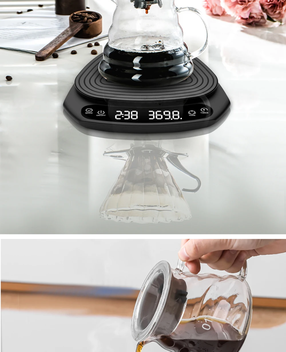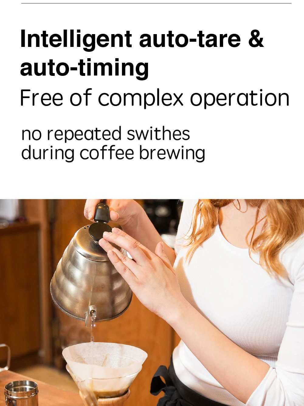 Положите в кофейную пудру, и весы будут автоматически терять снова в течение 3 секунд. Затем начните заливать воду, чтобы сделать кофе. Электронные весы автоматически запускают время и взвешивание.