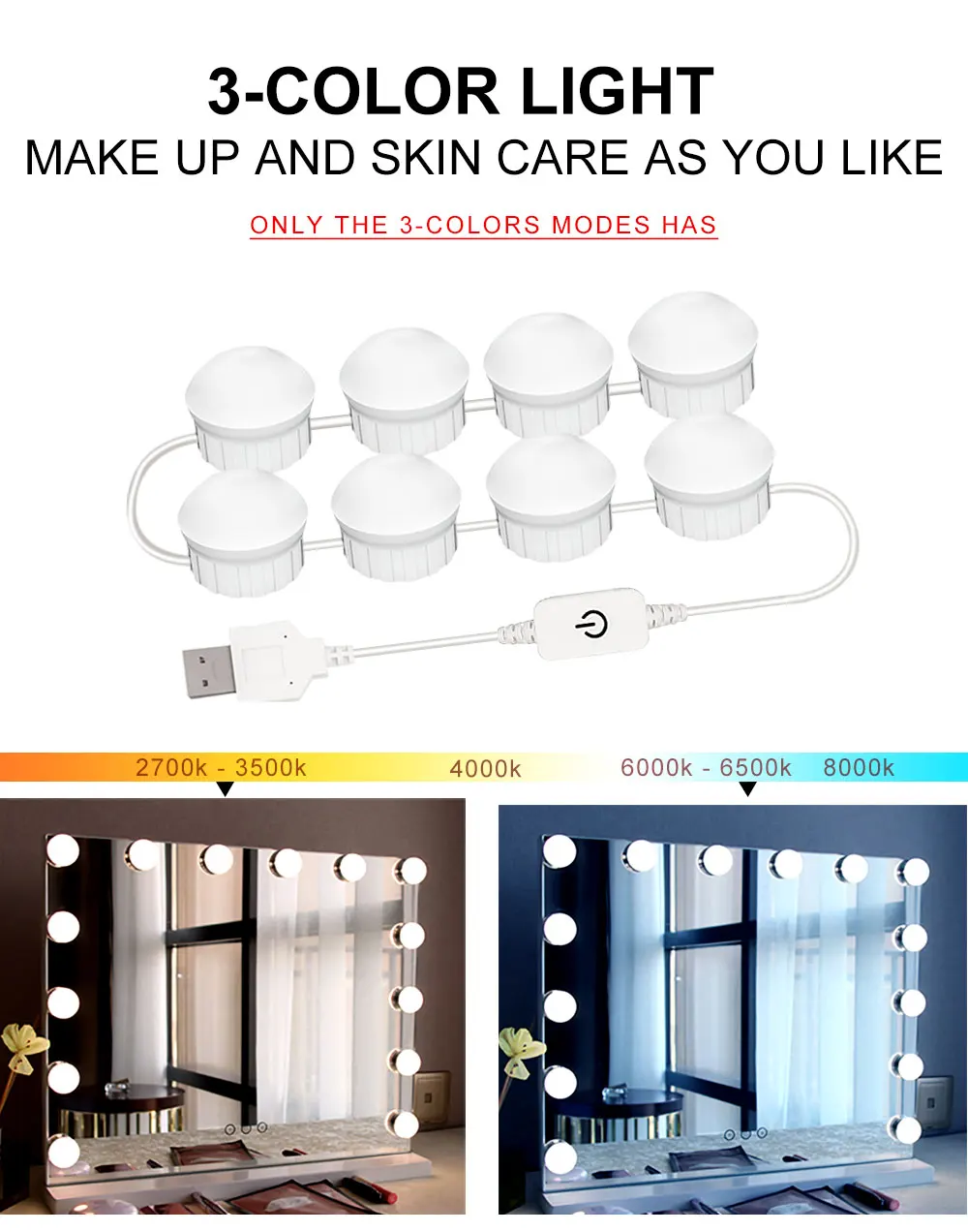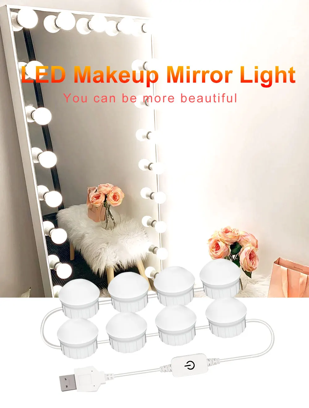 В голливудском стиле светодиодные зеркала, 10 лампочек могут быть объединены по желанию, равномерно заполняют свет под разными углами, макияж не имеет темных углов и теней, и детали более четкие, избегайте стыда недостаточного макияжа, вызванного недостаточным светом, который должна иметь каждая красивая девушка