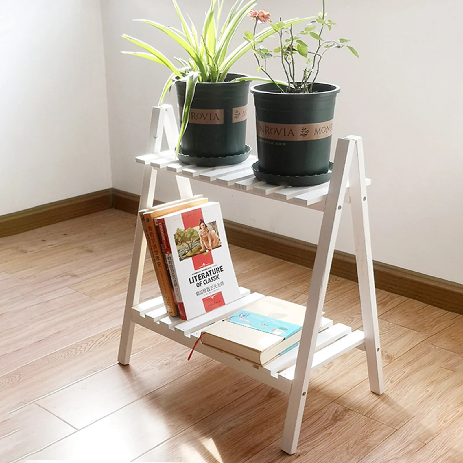 1. Внешний вид натурального твердого дерева: двухслойная подставка для лестниц изготовлена из высококачественной сосновой древесины и обработана 3 полировочными процессами и здоровым лаком, она прочная и красивая. Очаровательный способ показать все растения.