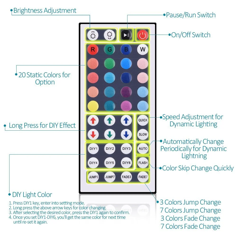 Светильник Тип: быстрая/медленная/Автоматическая/вспышка/7 цветов градиент/3 градиент цвета/7 цветов Изменение цвета/3 цвета/RGB Увеличение/уменьшение контроля