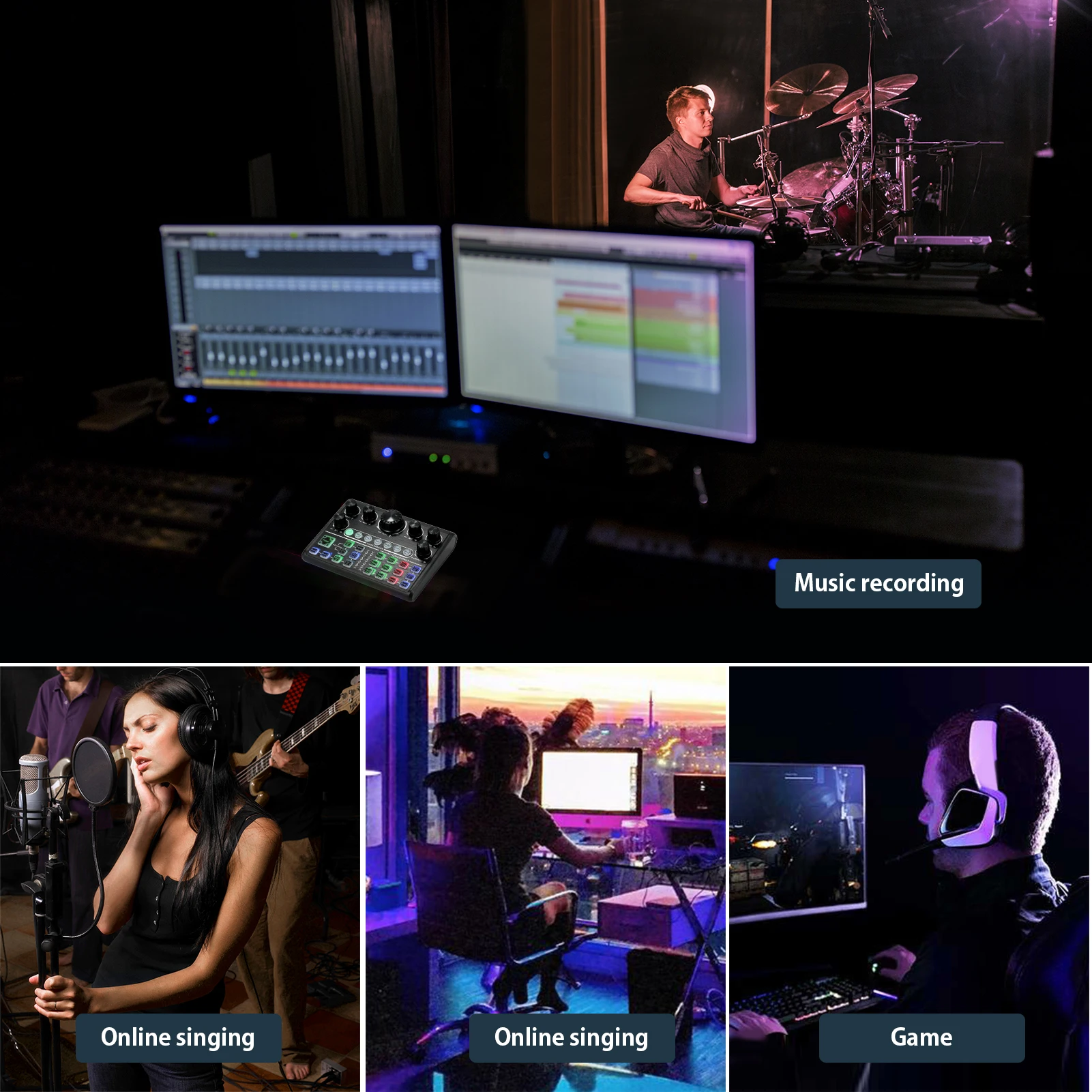 Звуковая карта использует высококачественный цифровой процессор и чип шумоподавления, для высокого качества звука; Она имеет 4 интересных режима, 3 магических режима звука, 8 спецэффектов, 12 электронных тонов, поддерживает мобильный телефон, планшет или компьютер, совместим с большинством основных программ прямого эфира, подходит для записи музыки, онлайн пения, Игры и т. Д. Сделайте вашу потоковую трансляцию более профессиональной.