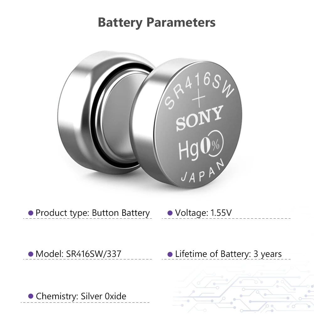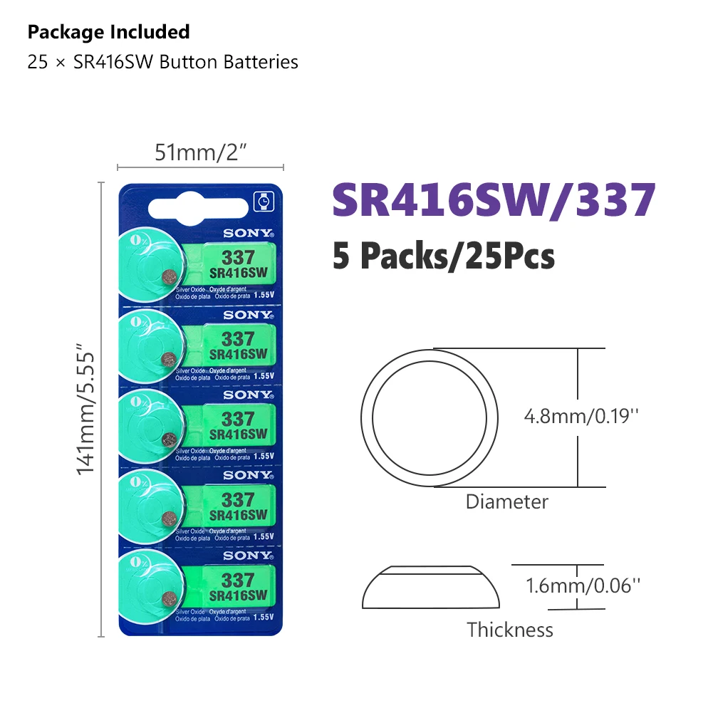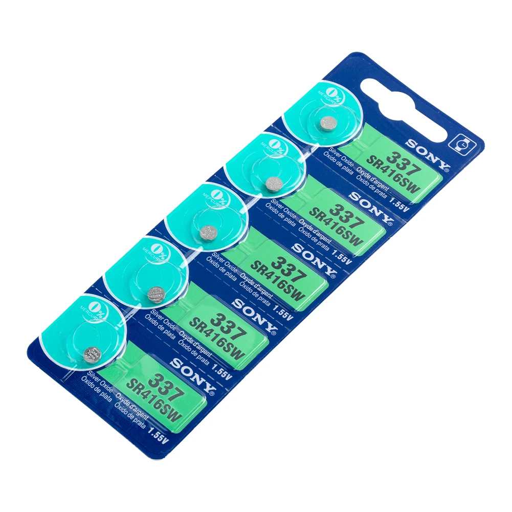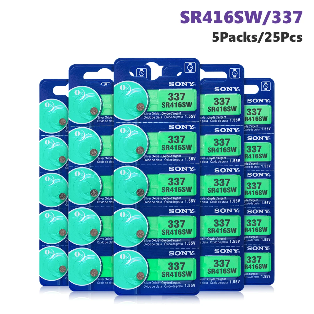 25 шт./лот, для Sony, 100% оригинал, 337 SR416SW, 1,55 в, оксид серебра, часы, батарея, SR416SW, 337 кнопка, монета, сделано в Японии Особенности 100% Новинка! Высокое качество 337/SR416SW батареи кнопки монет батареи, большая мощность для миниатюрные устройства. Прочный и экономичный, высокая плотность энергии, обеспечивает более длительный срок службы батареи и длительную мощность. Безопасность и отсутствие утечки, без ртути класса А, протестированы под строгими стандартами контроля качества. Используется для электрической игрушки, калькулятора, материнской платы компьютера, часов, камеры, автомобильной охранной сигнализации, автомобильных пультов без ключа, электронного слухового аппарата, КПК, электронных органайзеров, Ошейников для домашних животных, счетчика, дистанционного управления, электронного инструмента, измеритель уровня глюкозы в крови, измеритель уровня холестерина, светодиодный светильник и другие электронные приборы. Также известный как:SR416SW, 337, V337, GP337, SB-A5, 280-75, D337, LR416, 337A, 337X, SP337, E337 и т. Д. Технические характеристики Модель: 337/SR416SW Химия: оксид серебра Номинальное напряжение: 1,55 в Срок годности: От 2 до 3 лет Перезаряжаемый:Нет(Одно использование) Диаметр: 4,8 мм/0,19'' Высота: 1,6 мм/0,06'' Эквивалент/Замена для: SR416SW, 337, V337, GP337, SB-A5, 280-75, D337, LR416, 337A, 337X, SP337, E337 и т. Д. Внимание 1. Пожалуйста, допускайте небольшое отклонение цвета между бумажными картами и изображениями. 2. Пожалуйста, храните изделие батареи недоступном для ваших детей в чехол они глотать. 3. Пожалуйста, храните батареи в сухом и прохладном месте. Посылка в комплекте 25 батарей для монет