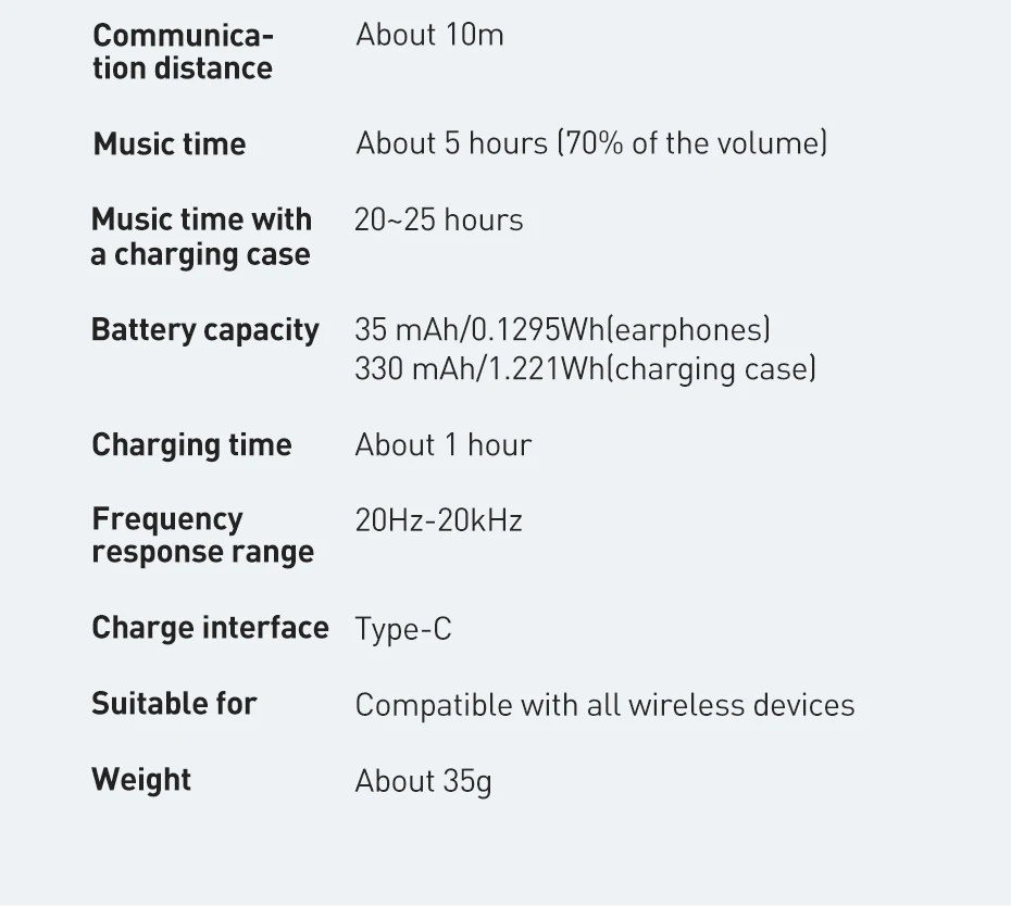 Зарядка через 10 мин (Слушайте музыку в течение 2 ч)0,06 секундная задержка (быстрая реакция)13 мм титановая диафрагма (высокое качество звука)Местоположение через приложение (Поиск наушников)IP64 пылезащитный и водонепроницаемый (путешествие без опасений дождя)25 часов долгий срок службы батареи