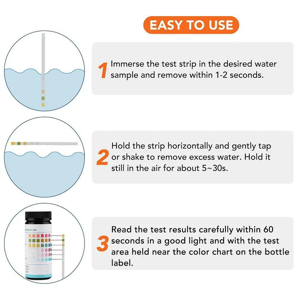 Простота в использовании: Замочите тестовую бумагу для питьевой воды в течение 5 секунд, поместите ее в воздух около 30 секунд, а затем Отрегулируйте цвет на задней части бутылки для чтения. Тест-полоски для питьевой воды просты в использовании даже для начинающих.
