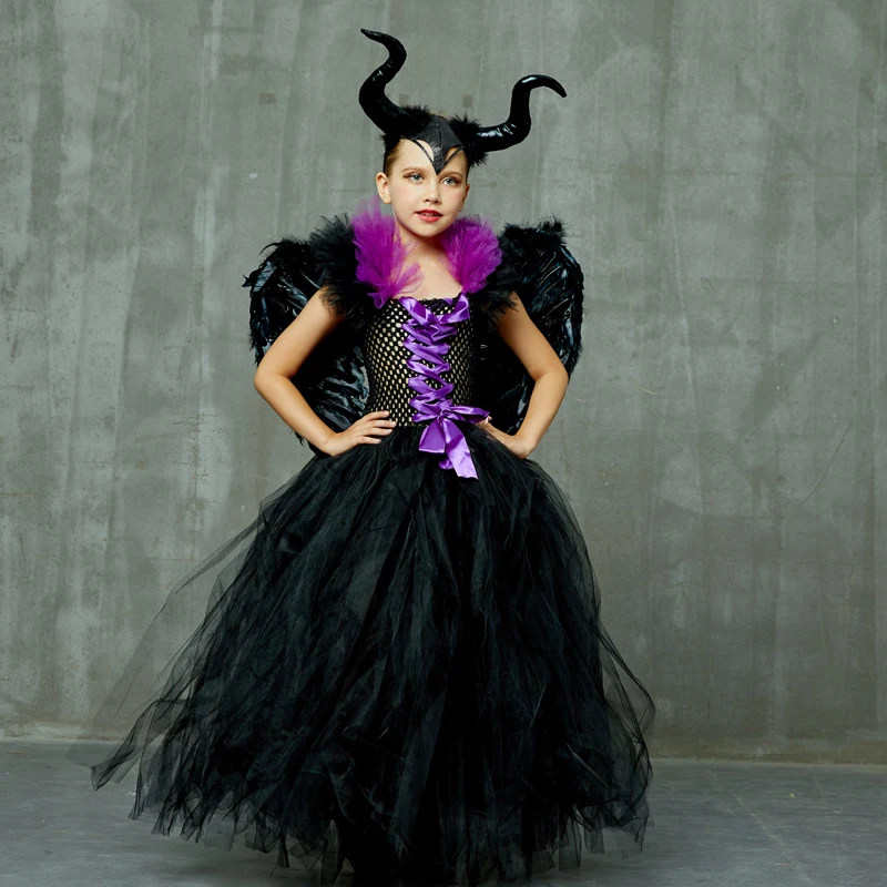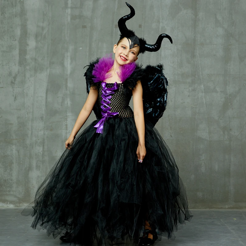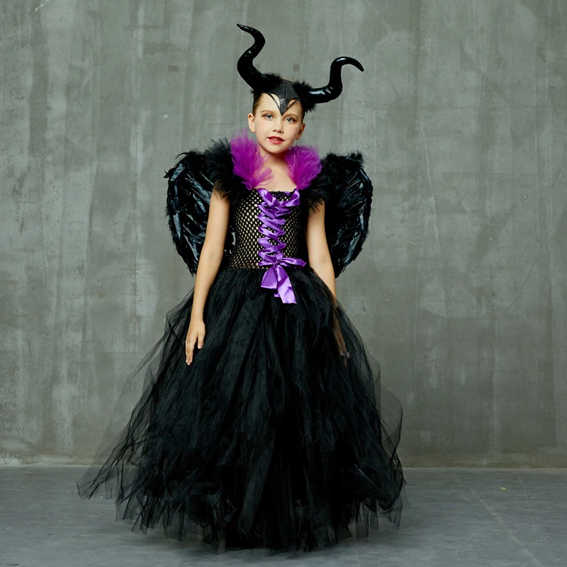Детская одежда платье-пачка для девочек с рогами, крыльями, Хэллоуин, косплей, костюм ведьмы для детей вечерние чное платье