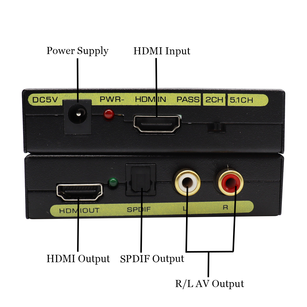 Он может извлечь цифровой звуковой сигнал, встроенный в HDMI-compatiblesource и преобразуйте ее через 3,5 мм L/R аналоговый выход и SPDIF выход в одно и то же время.