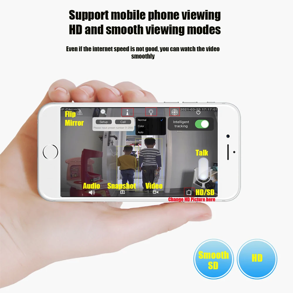 Камера имеет микрофон и динамик внутри, вы можете двухсторонний аудио разговор между камерой и телефоном, аудио запись с видео.