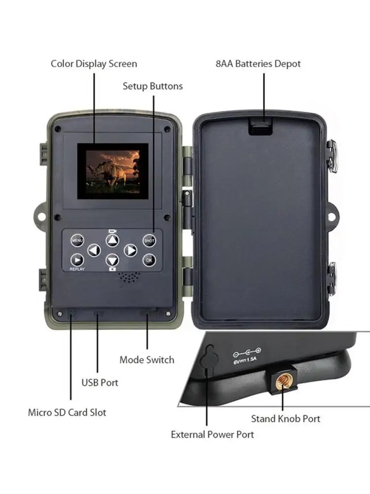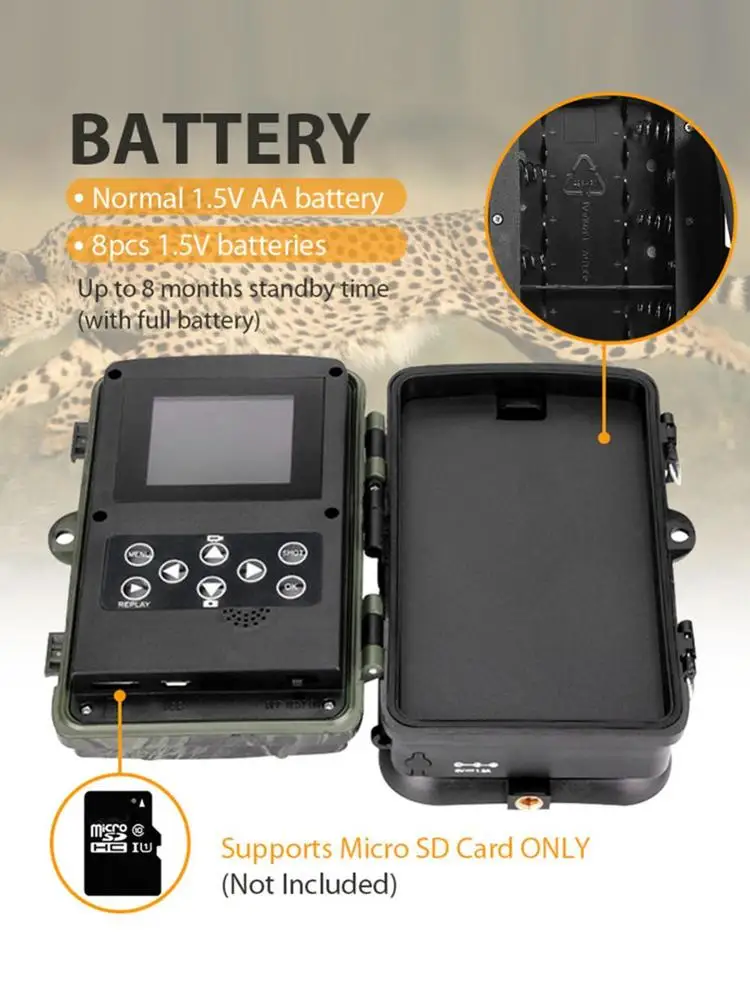 Поддержка Micro SD карты/USB / AV выход (не включая sd-карту). -Отличный инструмент для охоты, путешествий, кемпинга, отслеживания домашних/диких животных. Простота в использовании и сборке. -Это может быть вызвано любым движением человека (или животного) в определенной области, контролируемой датчиком движения. -Дальний инфракрасный-это Входное устройство камеры, в основном используемое для настройки клиента. Максимальное расстояние дистанционного управления составляет 20 метров. -Фиксированная веревка с пряжкой, легко фиксируется на палках деревьев и ветках.