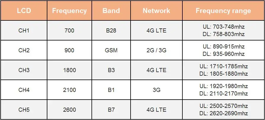 Этот 5 band Усилитель сигнала может повысить 2G, 3G, 4G, полос. Не беспокойтесь, чтобы выбрать различные усилители сигнала для различных частот сигнала больше.