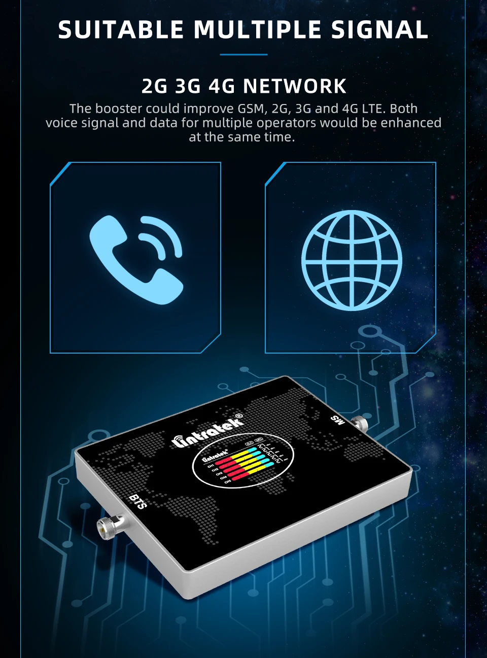 Этот усилитель может улучшить GSM, 2G, 3G и 4G LTE-сигнал. Одновременно будут улучшены как голосовой сигнал, так и данные для нескольких операторов.