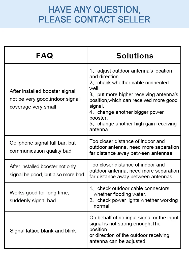 3. Наш продукт может повысить хороший внутренний сигнал, только если ваш наружный сигнал идеально, пожалуйста, убедитесь, что ваш боковой наружный сигнал хороший, если нет, наше устройство не может расширить все, что вы ожидаете.