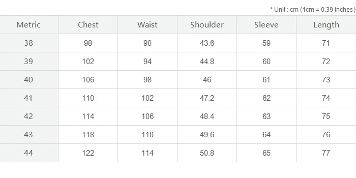 2) Как правило, размер рубашки должен быть больше вашего размера. Вы можете проверить свою обычную рубашку. Если обхват груди 100 см, мы предлагаем вам выбрать рубашку с 104 см или 108 см.