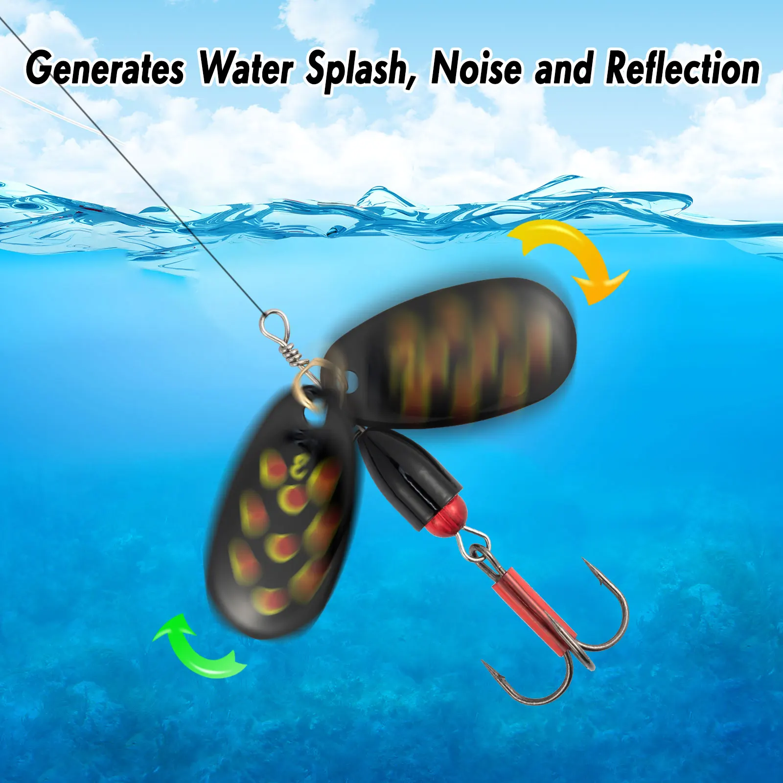 【Уникальная особенность 】Лопасти Индианы могут вращаться на 360 ° в воде, чтобы производить брызги воды и мигать, в то время как другие металлические части сталкиваются, чтобы генерировать шум для привлечения рыбы.