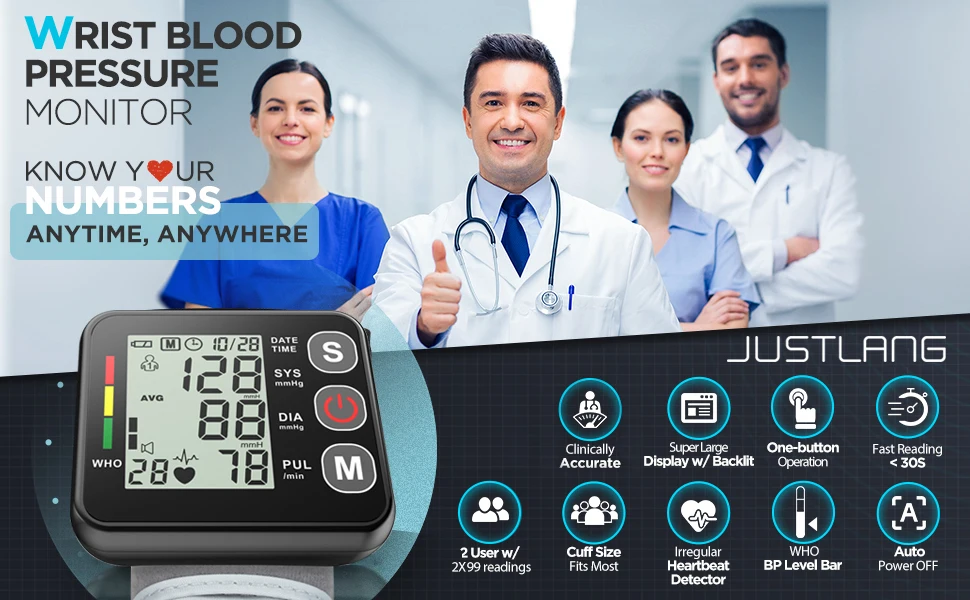 Цифровой монитор артериального давления Justlang чрезвычайно прост в использовании с одной кнопкой, полностью автоматическим сжатием и декомпрессией. Просто наденьте запястье, нажав кнопку переключения, и вы получите точные показания в течение 60 секунд.