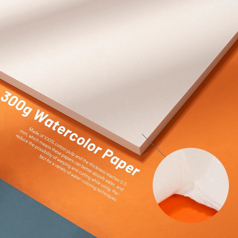 5. 300gsm Акварельная бумага: Изготовлен из 100% хлопок целлюлозно-толщина достигает 0,5 мм, что означает, что эти документы может лучше впитывать воду и снизить риск возникновения деформации и завивки волос во время использования. Идеально подходит для различных методов окраски воды.