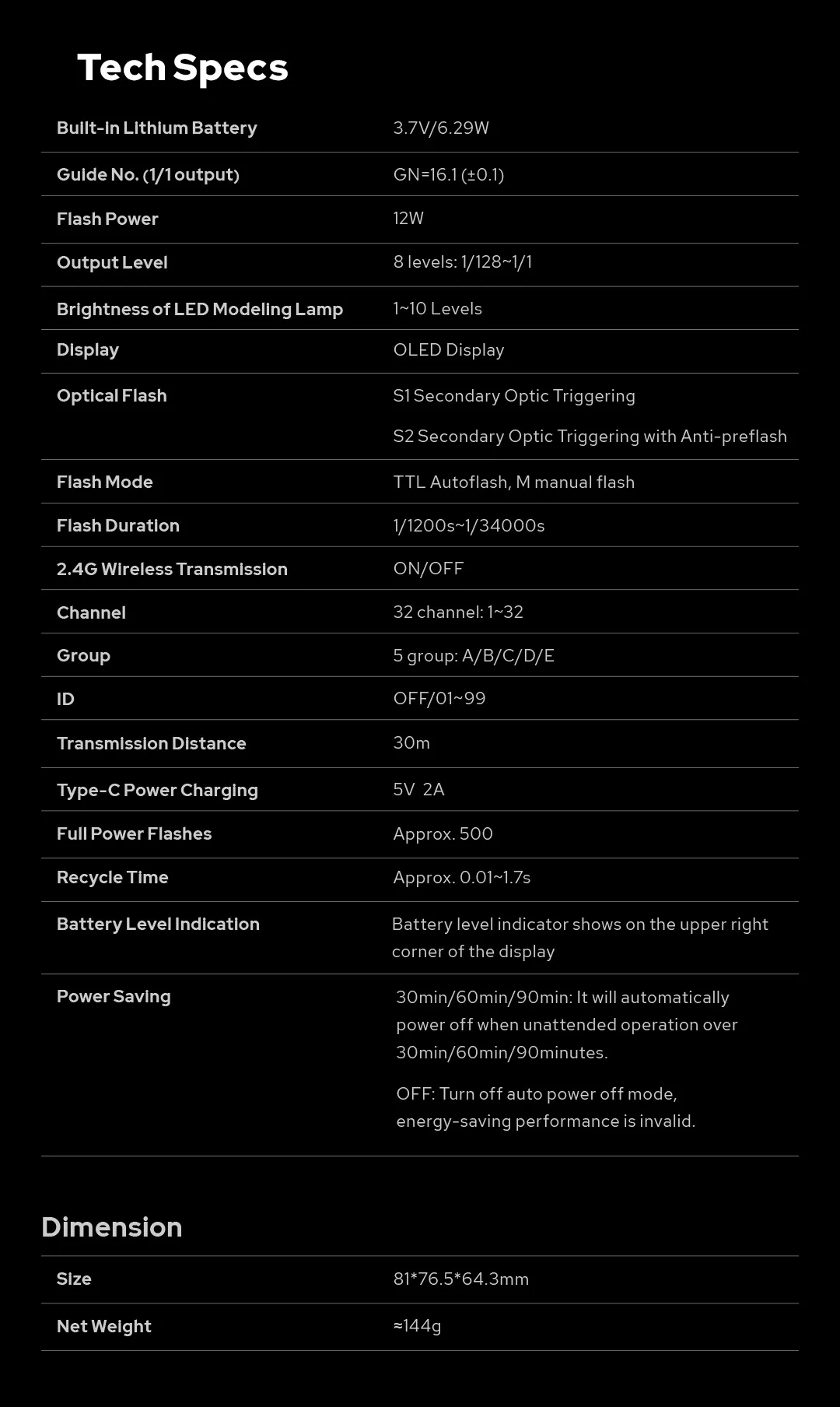 2. Перезаряжаемые литиевая батарея: Мощный встроенный литиевая батарея поддерживает примерно 500 вспышек полной мощности с 0,01 до 1,7 во-вторых время зарядки. Аккумулятор также легко заряжается через прилагаемый кабель USB Type-C.