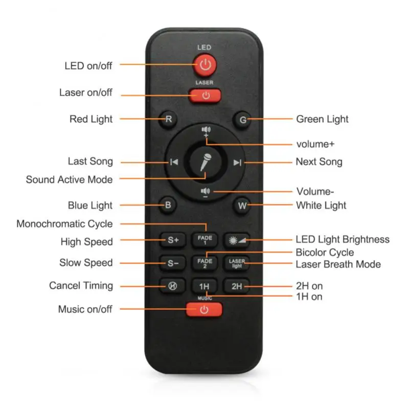 2. Пульт дистанционного управления может управлять цветом водяного знака aurora, скоростью водяного знака aurora, режимом водяного знака aurora, режимом Bluetooth, одиночным управлением водяным знаком aurora, одно лазерное управление, яркость, управление музыкой, управление звуком, режим выбора, Функция таймера и переключатель.