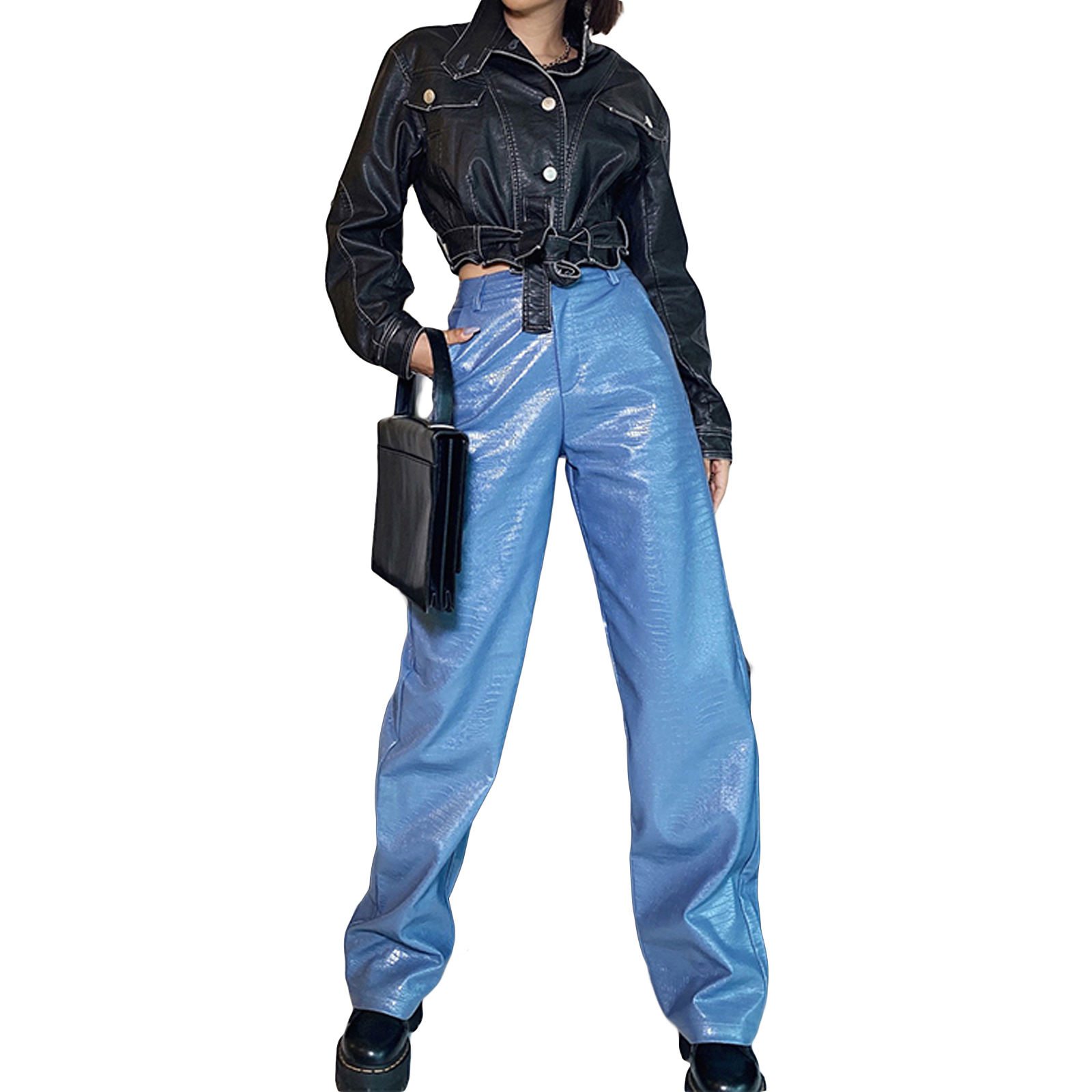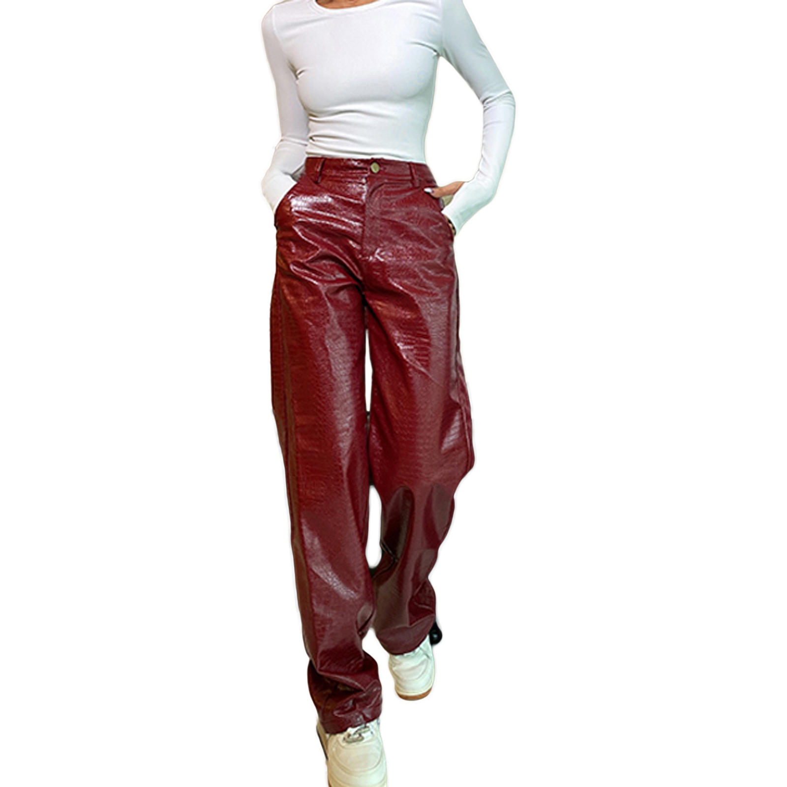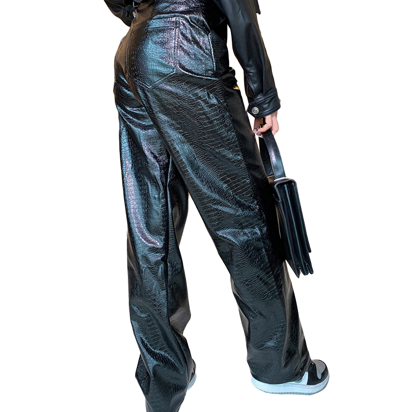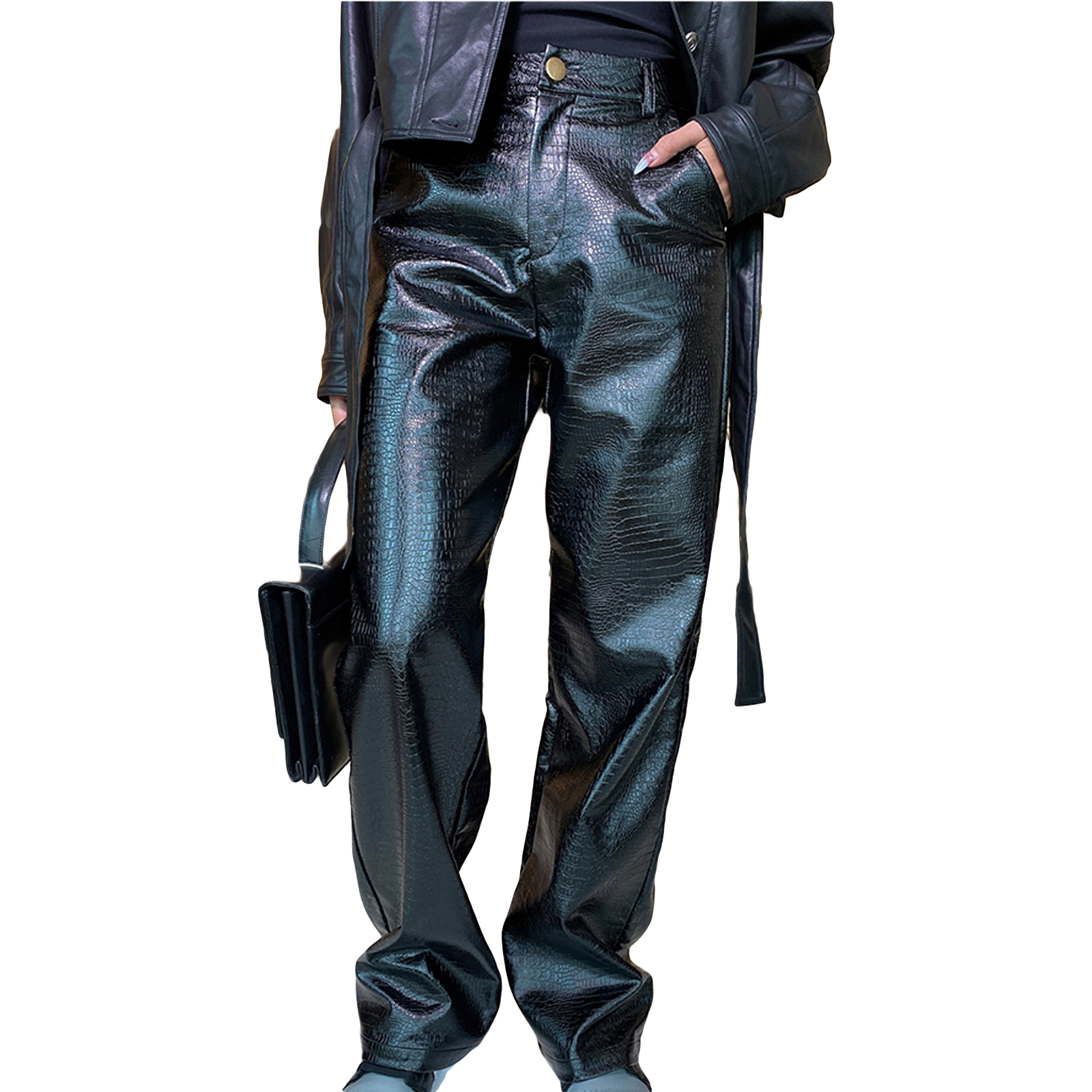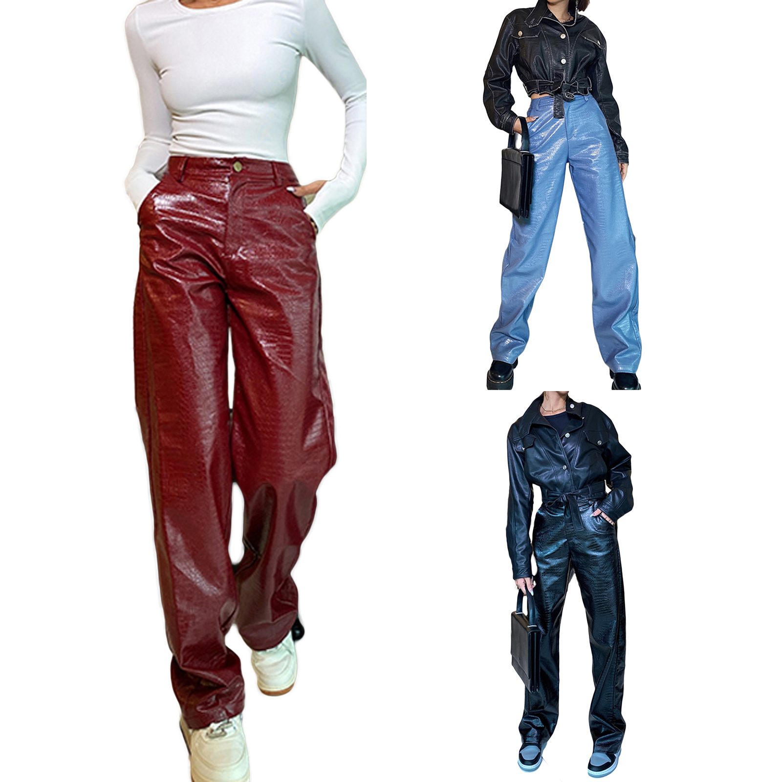 Женские кожаные брюки, с высокой талией и боковыми карманами, свободные прямые Повседневные Вечерние брюки на весну и осень