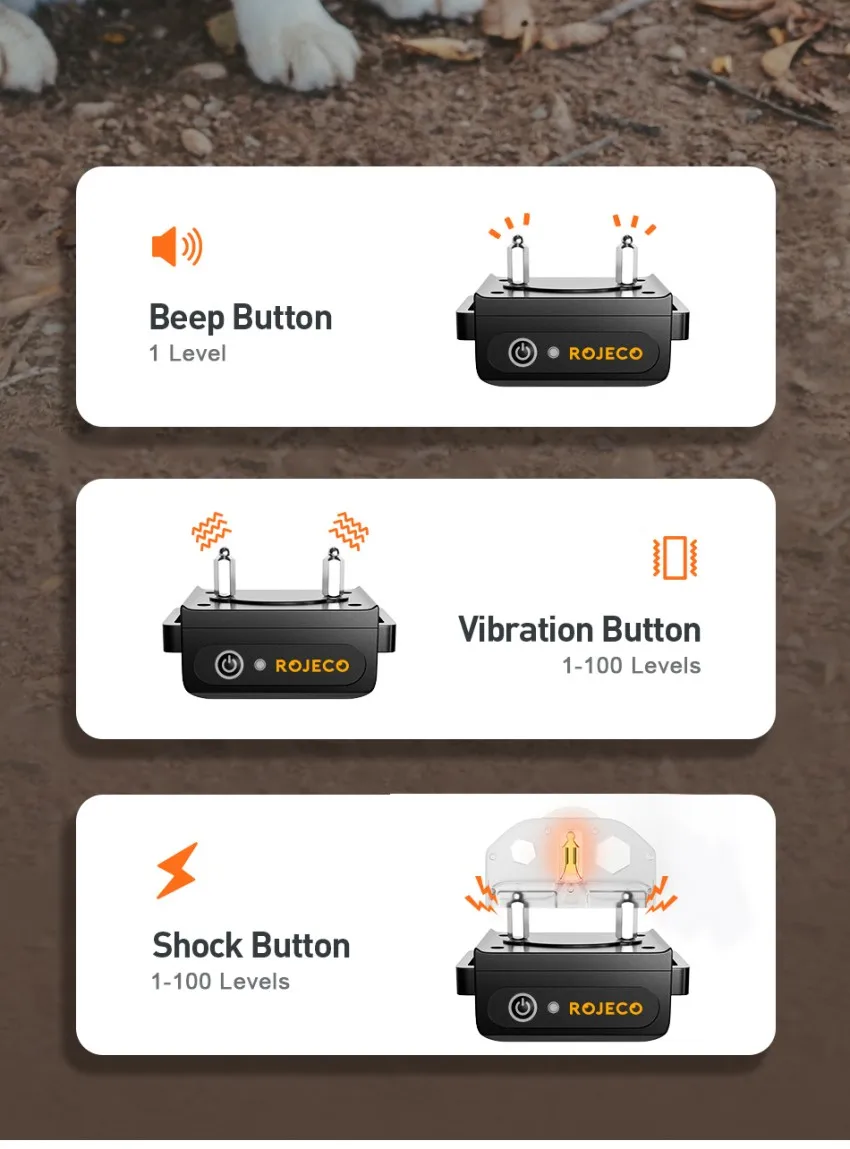 -Регулируемые Уровни: уровни вибрации и ударов регулируются от 1 до 100, и вам рекомендуется попробовать уровни постепенно, чтобы найти правильный при использовании этой системы обучения домашних животных в первый раз