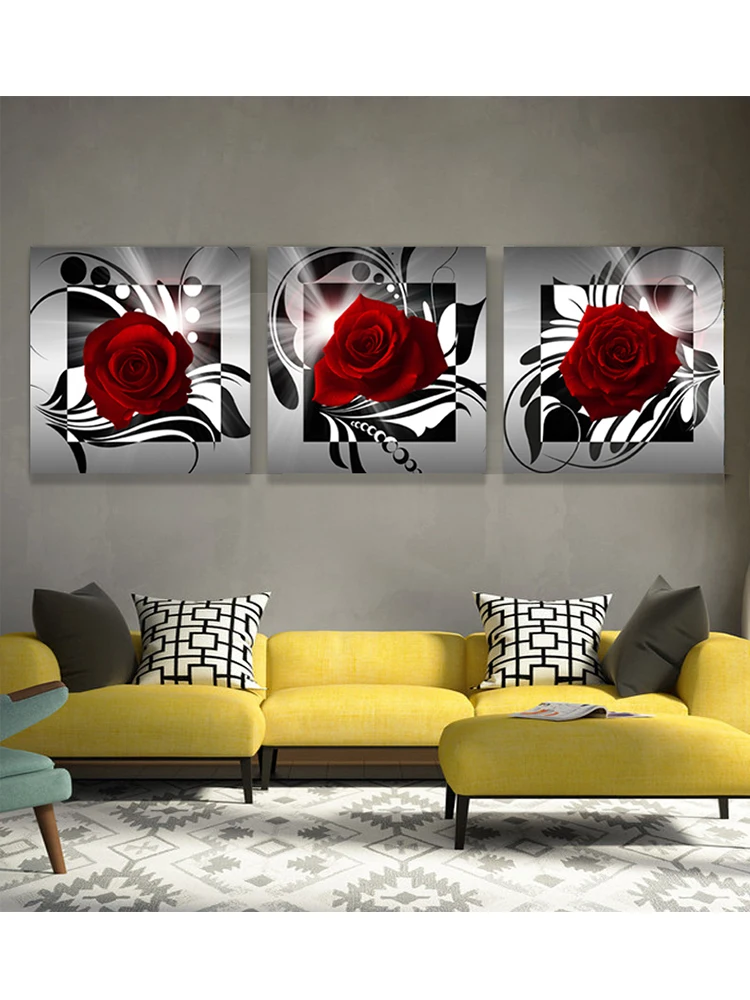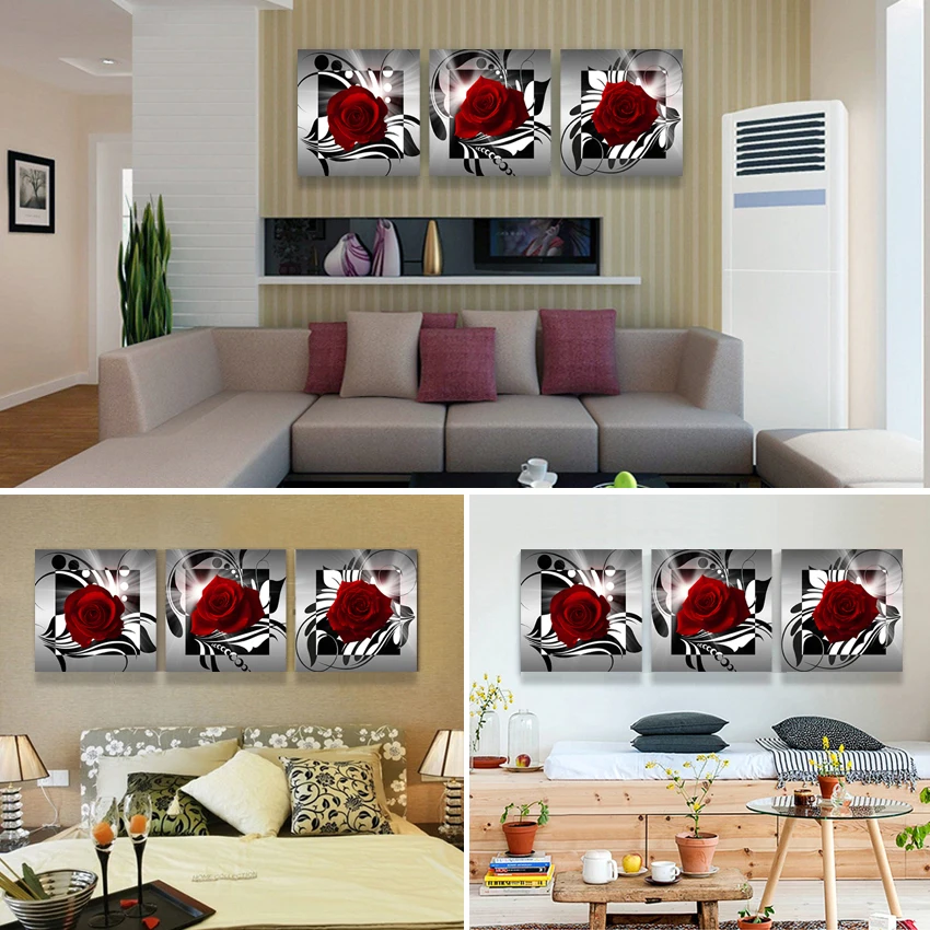 3 шт., черный, красный цветок розы, алмазная вышивка, Полный Круглый алмаз, картина, стразы, мозаика, Триптих, наклейки на стену