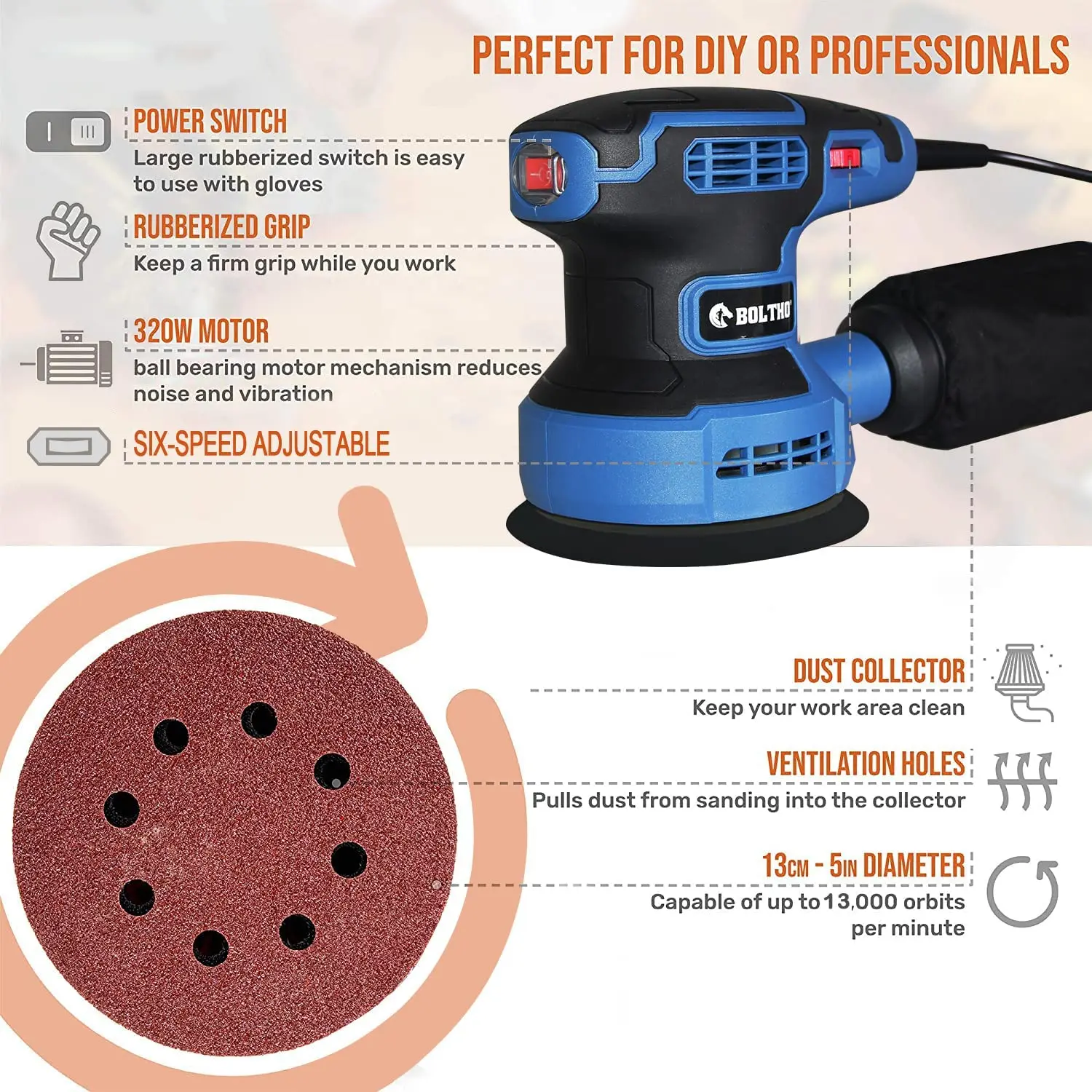 BOLTHO 320W 125 мм случайный орбитальный шлифовальный станок с мешком для пыли и шлифовальными дисками для дерева металла, пластиковой орбиты