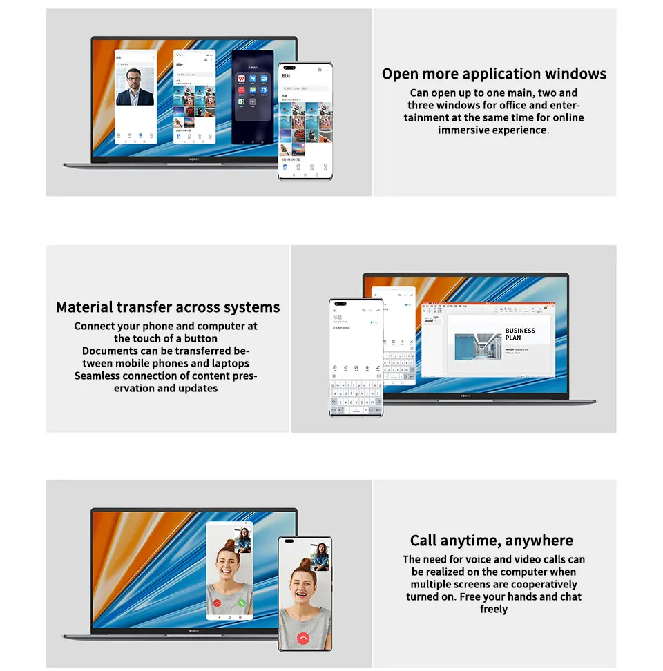 Многоэкранное сотрудничество теперь может поддерживать до трех отдельных приложений, чтобы сохранить жизнь на вашем рабочем столе HONOR MagicBook 16 Pro 2021. Многоэкранное сотрудничество позволяет вам делиться экраном и файлами вашего смартфона на HONOR MagicBook 16 Pro 2021, позволяя редактировать их с той же клавиатурой и мышью. Возьмите именно то место, где вы остановились без необходимости прыгать между устройствами.